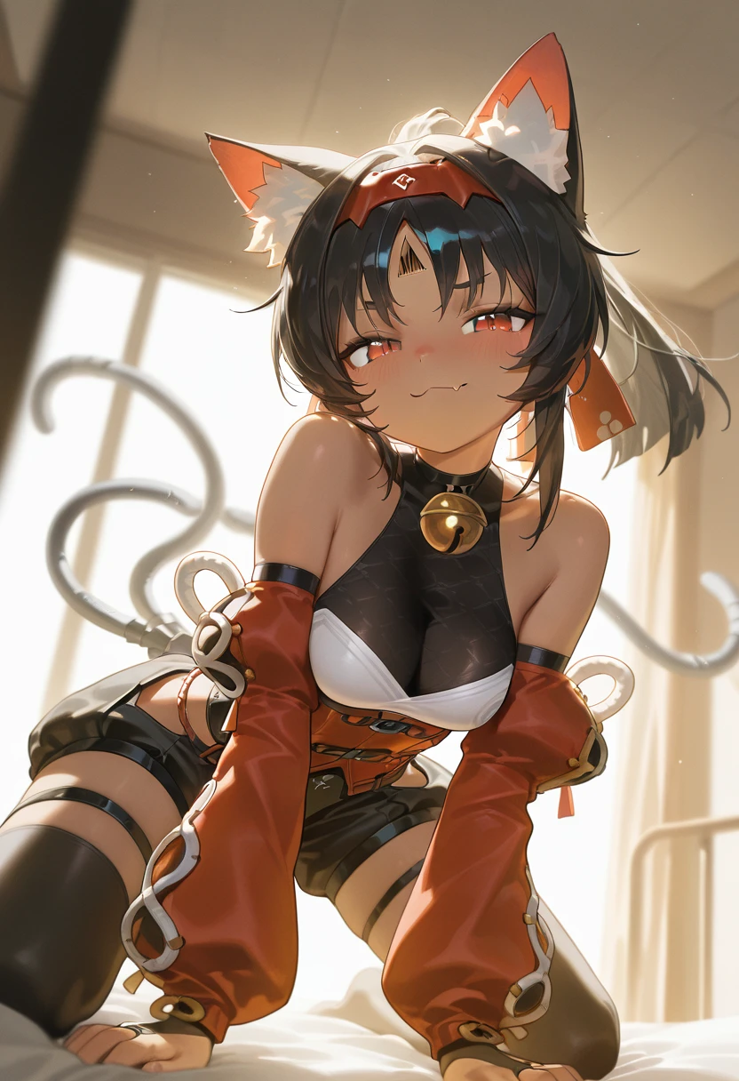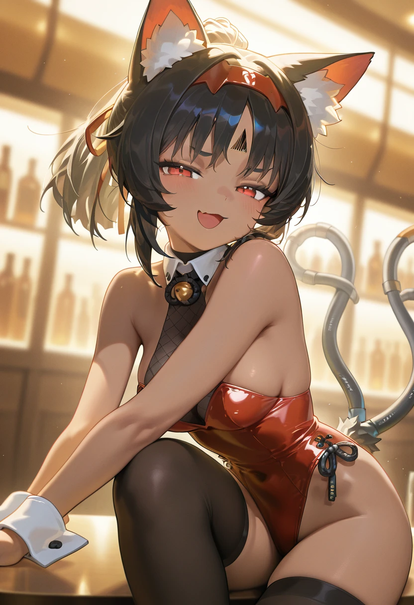 Tags for her look: 1girl, solo, short hair, black hair, red eyes, ponytail, medium breasts, hairband, skin fang, cat ears, animal ear fluff, dark-skinned female, cat tail, cat girl, forehead mark, red hairband, two tails, forehead jewel, mechanical tail, sidelocks,