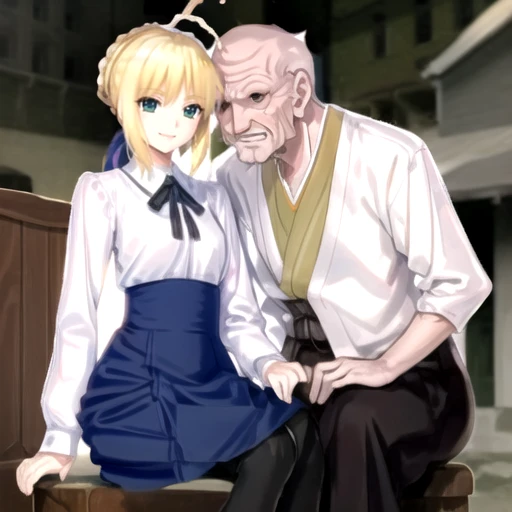 ZoukenArtoria, an old man and a woman, hetero, standing, smile, cowboy shot