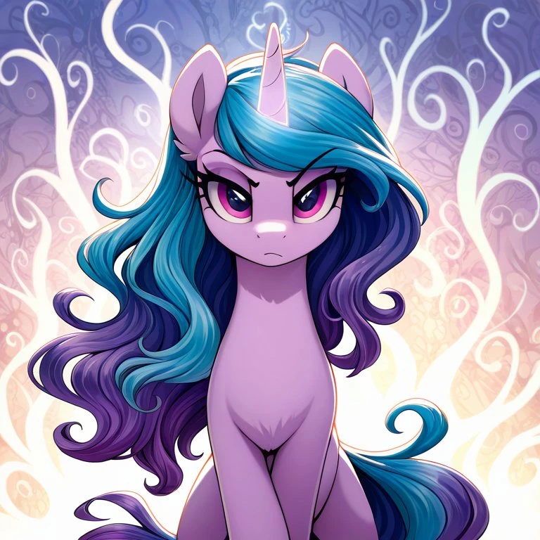 unicorn, lavender body, purple eyes, mane and tail that go from blue to dark purple, with wavy locks