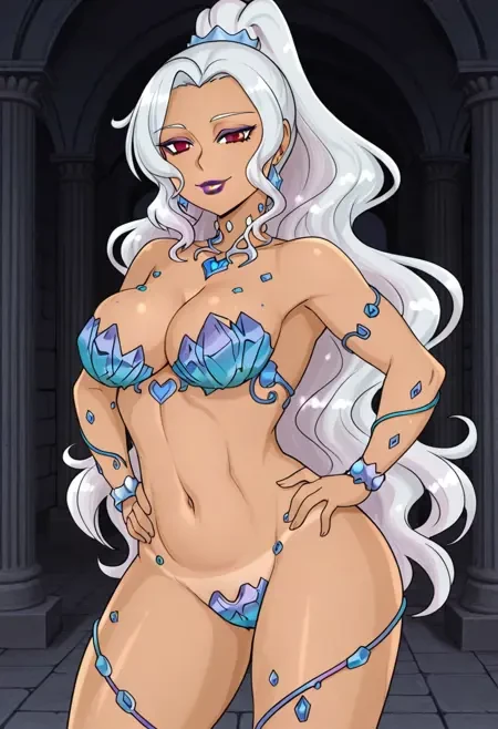 ClarissaJewel, 1girl, solo, large breasts, wavy hair, sidelocks, parted bangs, red eyes, navel, wide hips, lipstick, jewelry, makeup, eyeshadow, purple lips, grey hair, multicolored hair, two-tone hair, white hair, mature female, fair tanned-skinned female, cleavage, thick thighs, very long hair, narrow waist, wide hips, high ponytail, toned belly, curvy, nude, shiny skin, smoothy skin,Outfit: