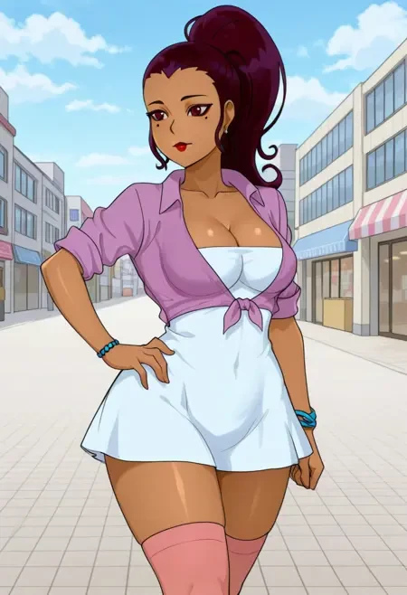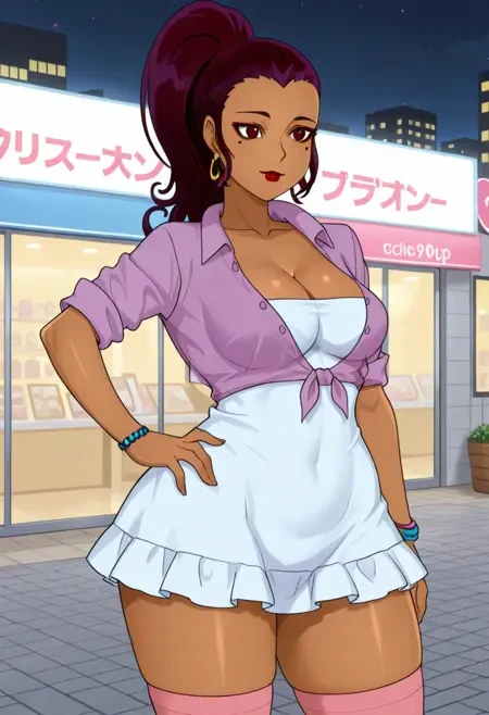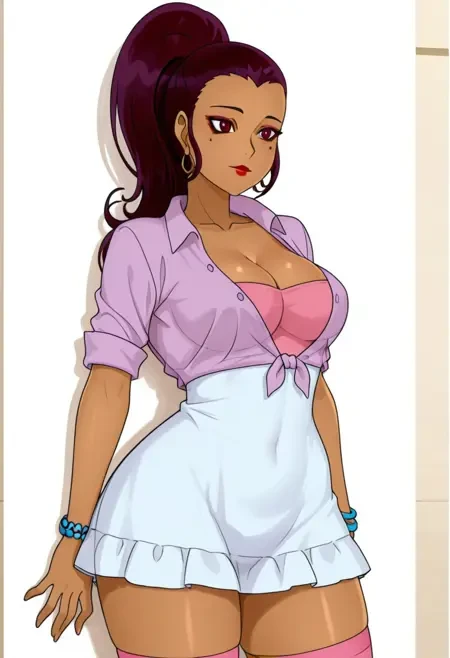 ClarissaNormal, 1girl, solo, dark crimson eyes, hair pulled back, dark purple hair, long hair, mole under eye, makeup, large breasts, mature female, dark-skinned female, gyaru, ponytail, thick thighs, wide hips, curvy, shiny skin, smoothy skin, Outfit: