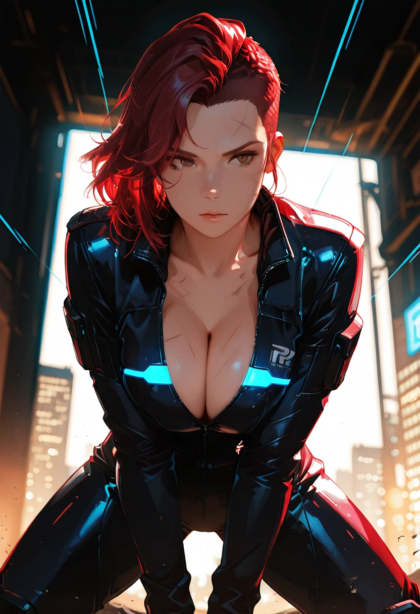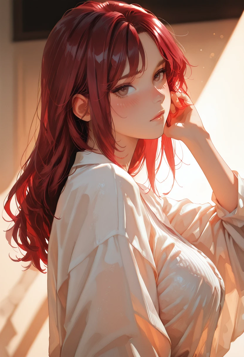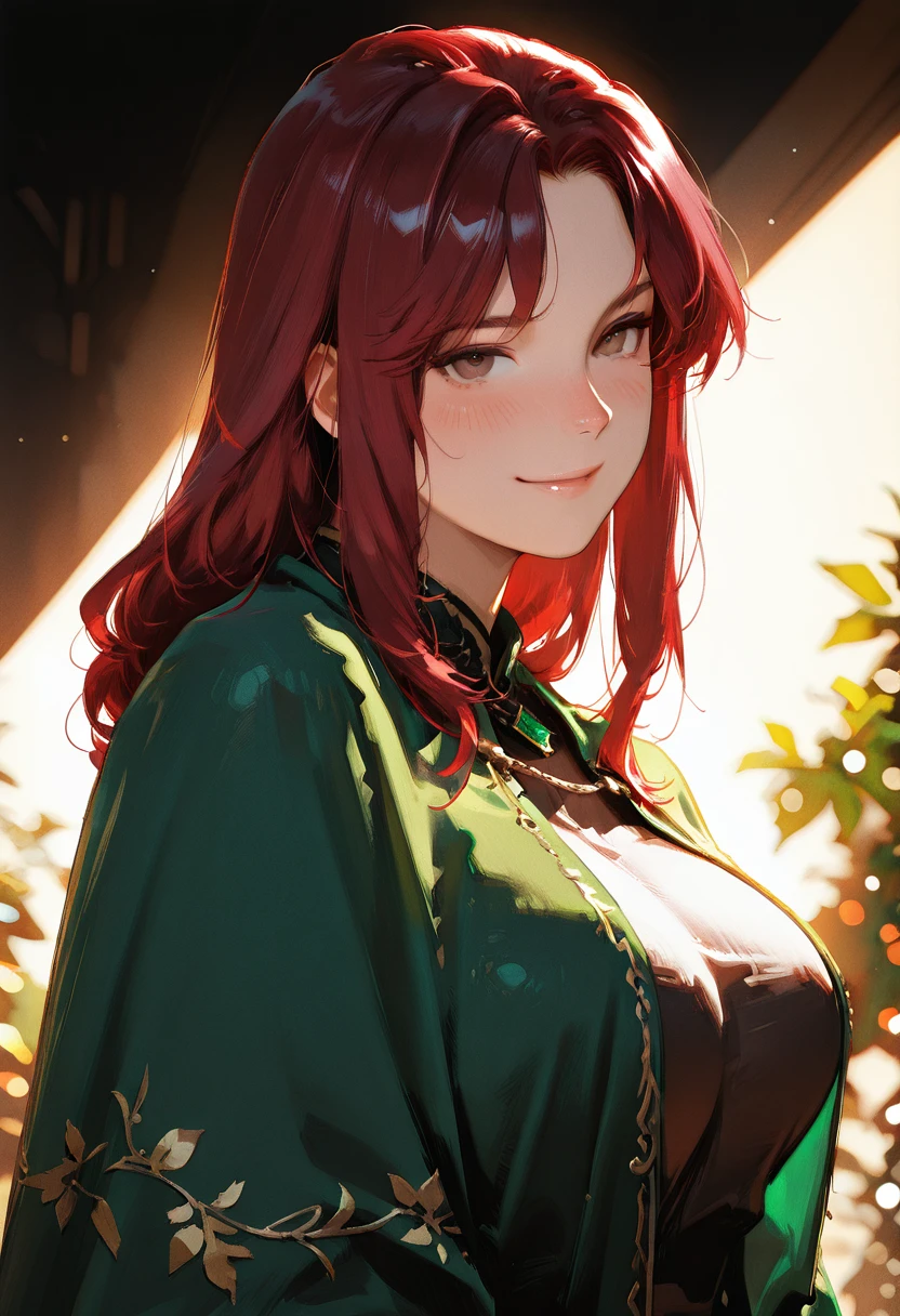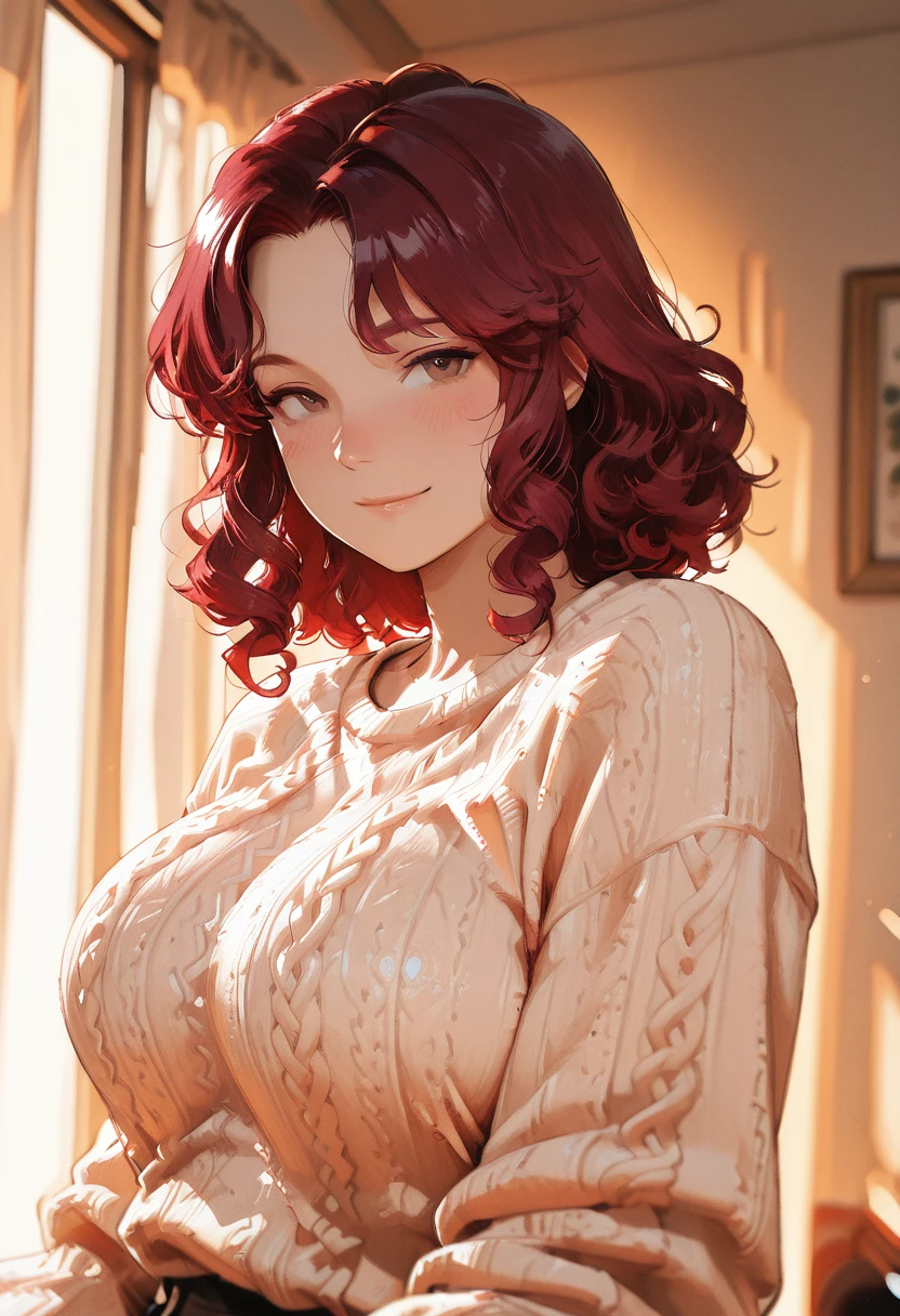 claire, brown eyes, dark red hair, curly_hair, large breasts,