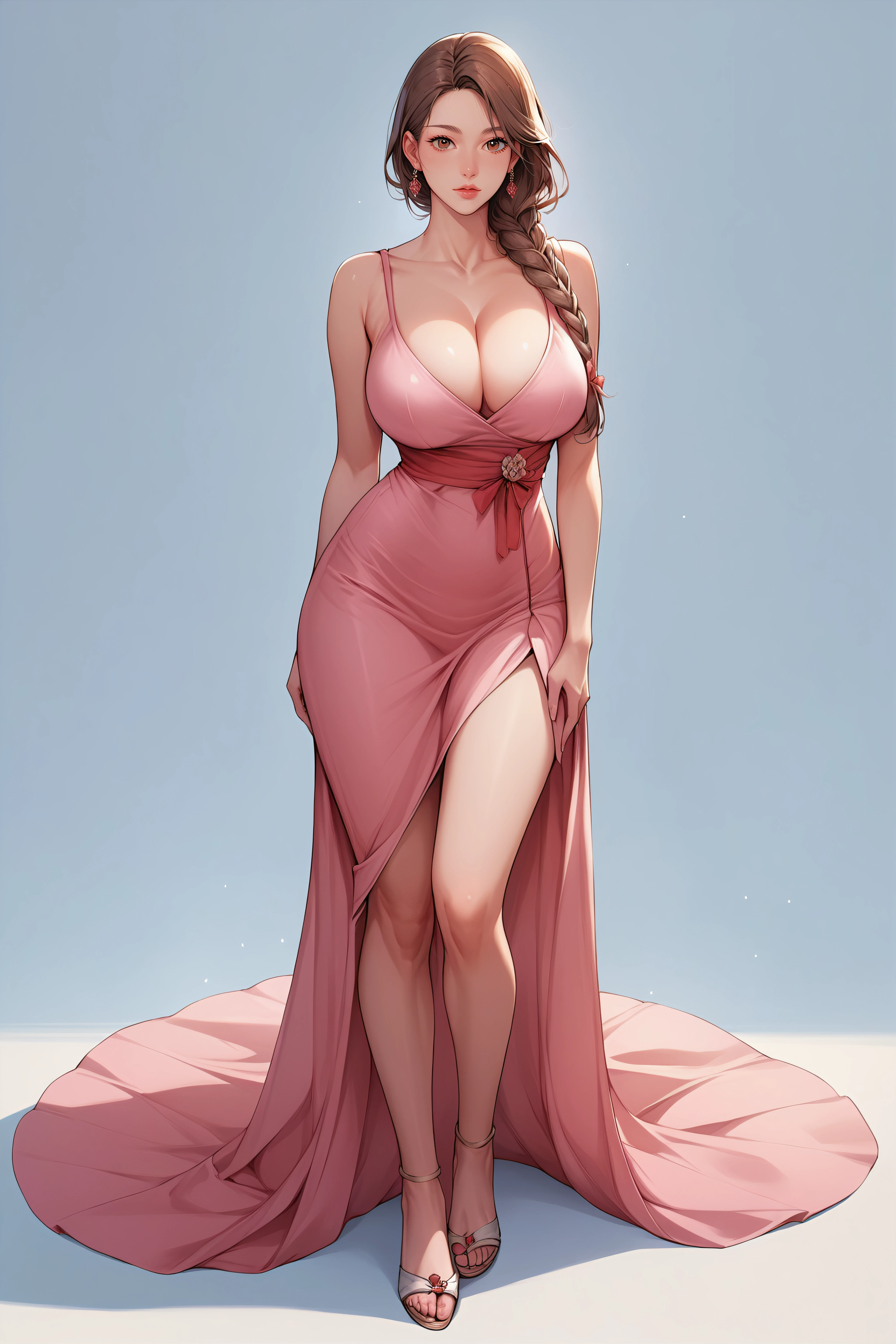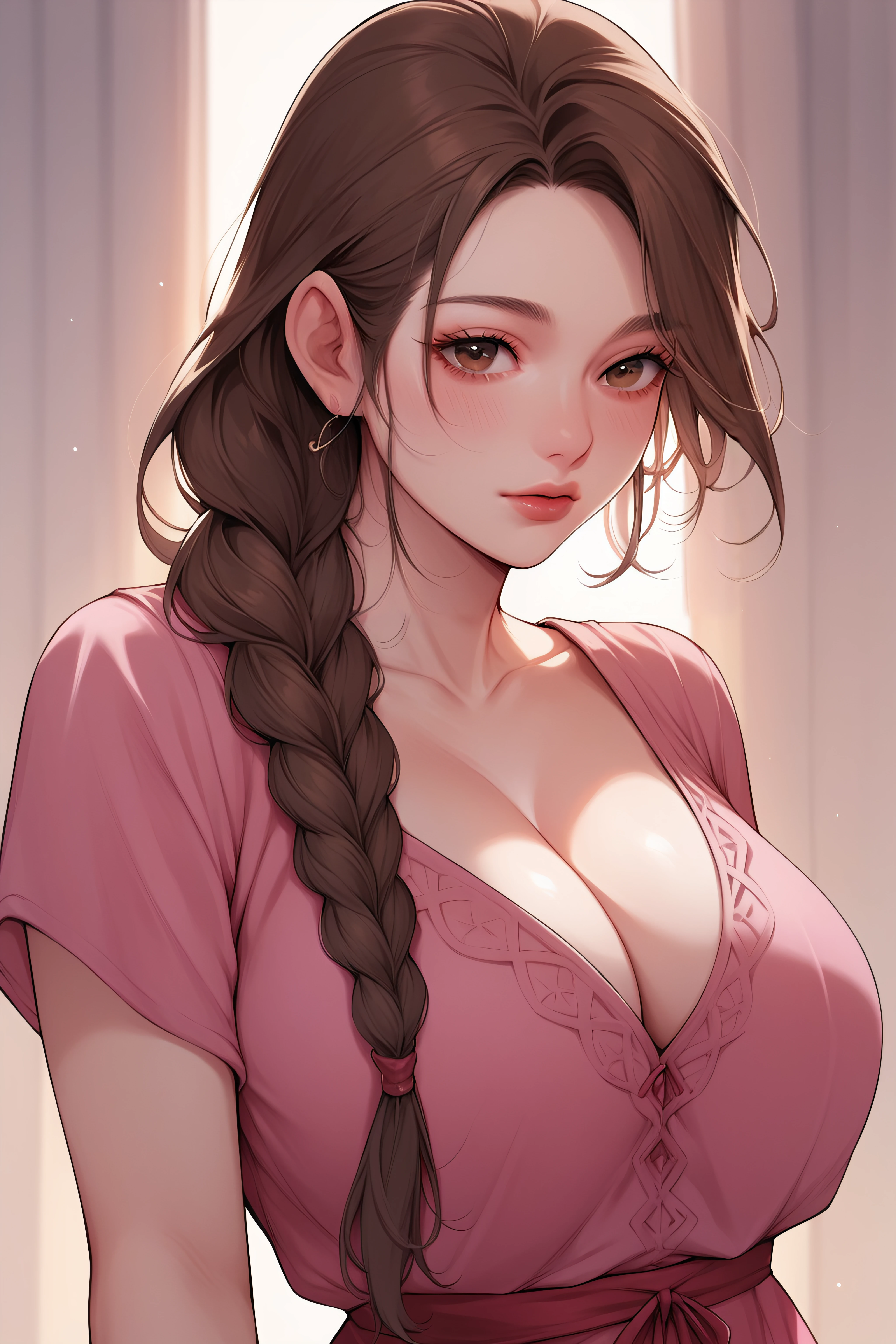 jumi, brown eyes, brown hair, single braid, large breasts, cleavage, long pink dress,