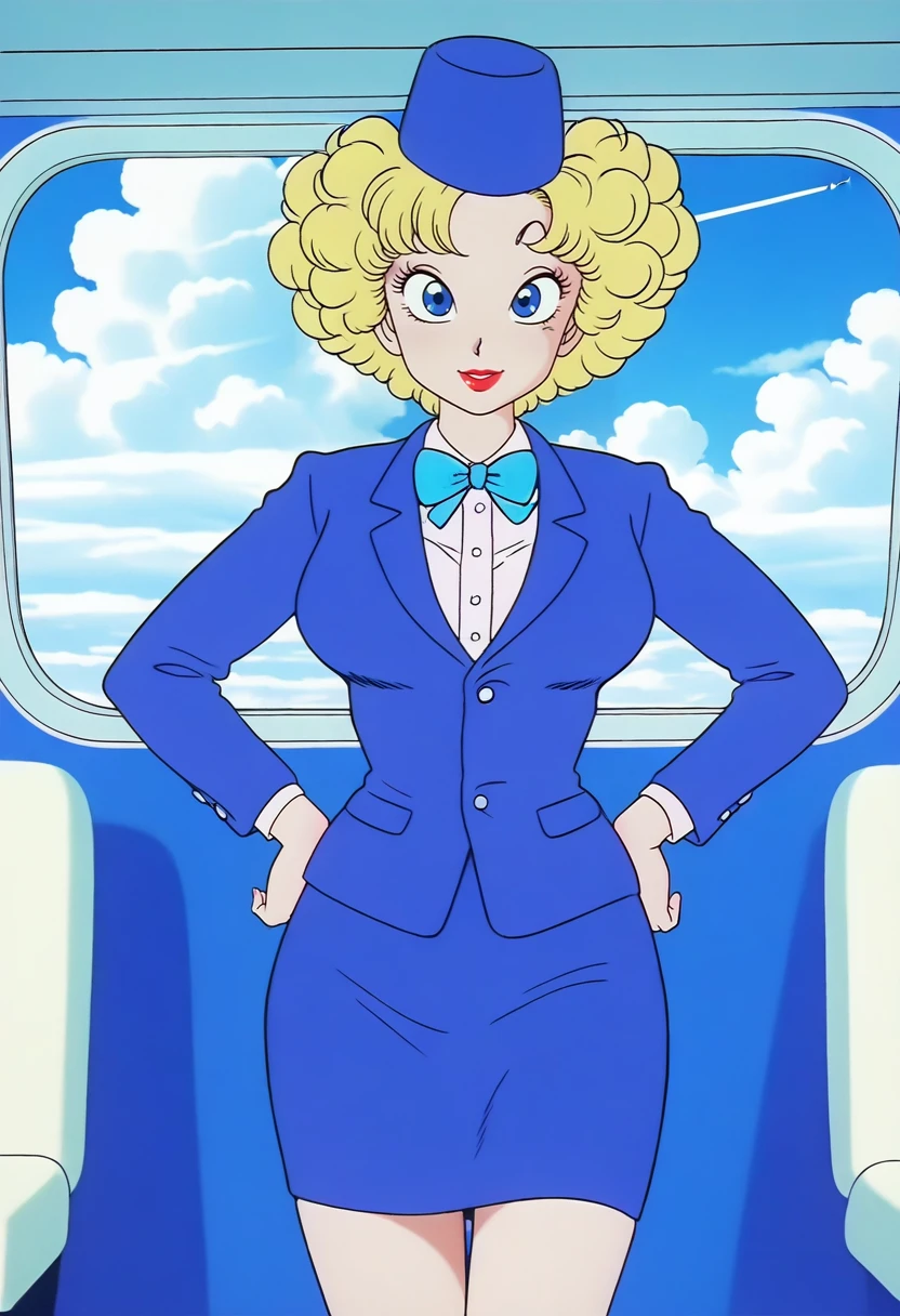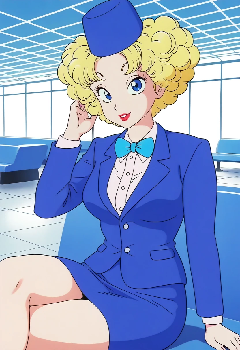 DBExtraGirl13FFA, 1girl, blonde hair, blue eyes, attendant hat, lipstick, curly hair, breasts, blue jacket, white shirt, light blue bowtie, pencil skirt, blue skirt, blue high heels, Information Desk Attendant: