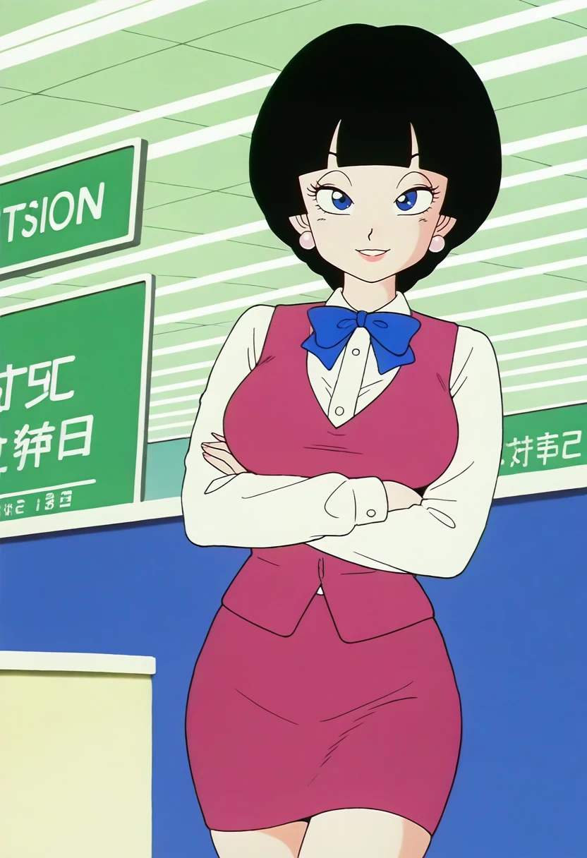 DBExtraGirl13IDA, 1girl, black hair, short hair, blunt bangs, dark blue eyes, white earrings, breasts, blue bowtie, purple vest, white shirt, pencil skirt, black high heels,Artistic Disclaimer: