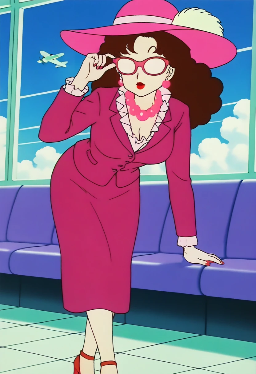DBExtraGirl13M, 1girl, pink hat, opaque glasses, glasses, brown hair, long hair, earrings, no eyes, lipstick, breasts, pearl necklace, purple jacket, long skirt, purple skirt, red high heels, Flight Attendant: