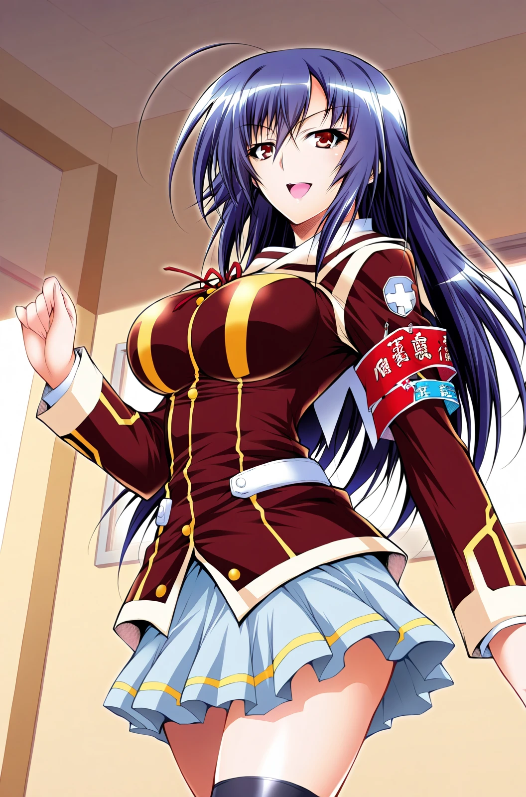 winter school uniform, armband, red blazer, long sleeves, yellow trim light blue skirt, black thighhighs,