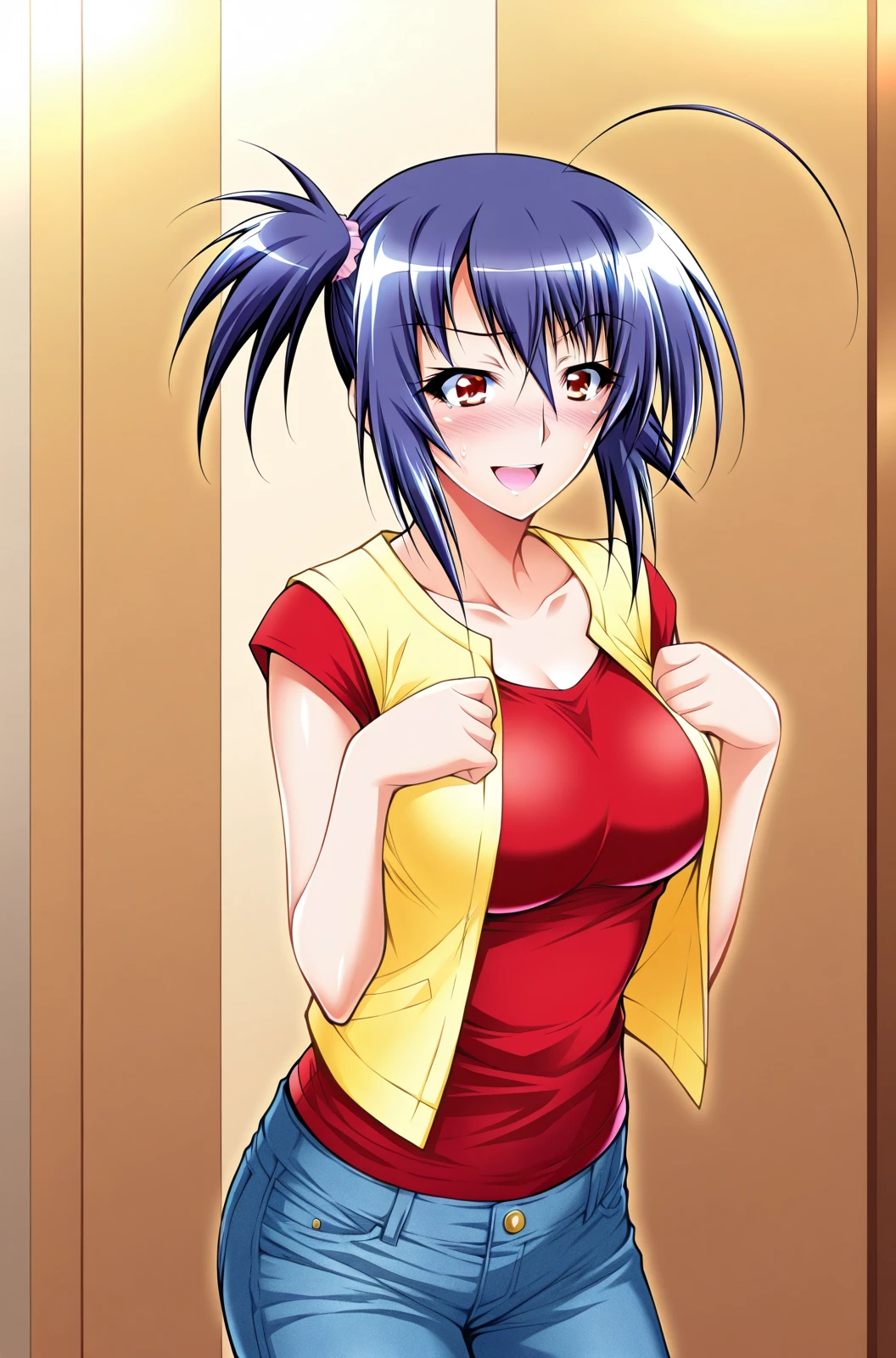 kurokami medaka, 1girl, blue hair, red eyes, short hair, ahoge, short ponytail, side ponytail, casual clothes, vest, yellow vest, red shirts, open vest, short sleeves, denim,