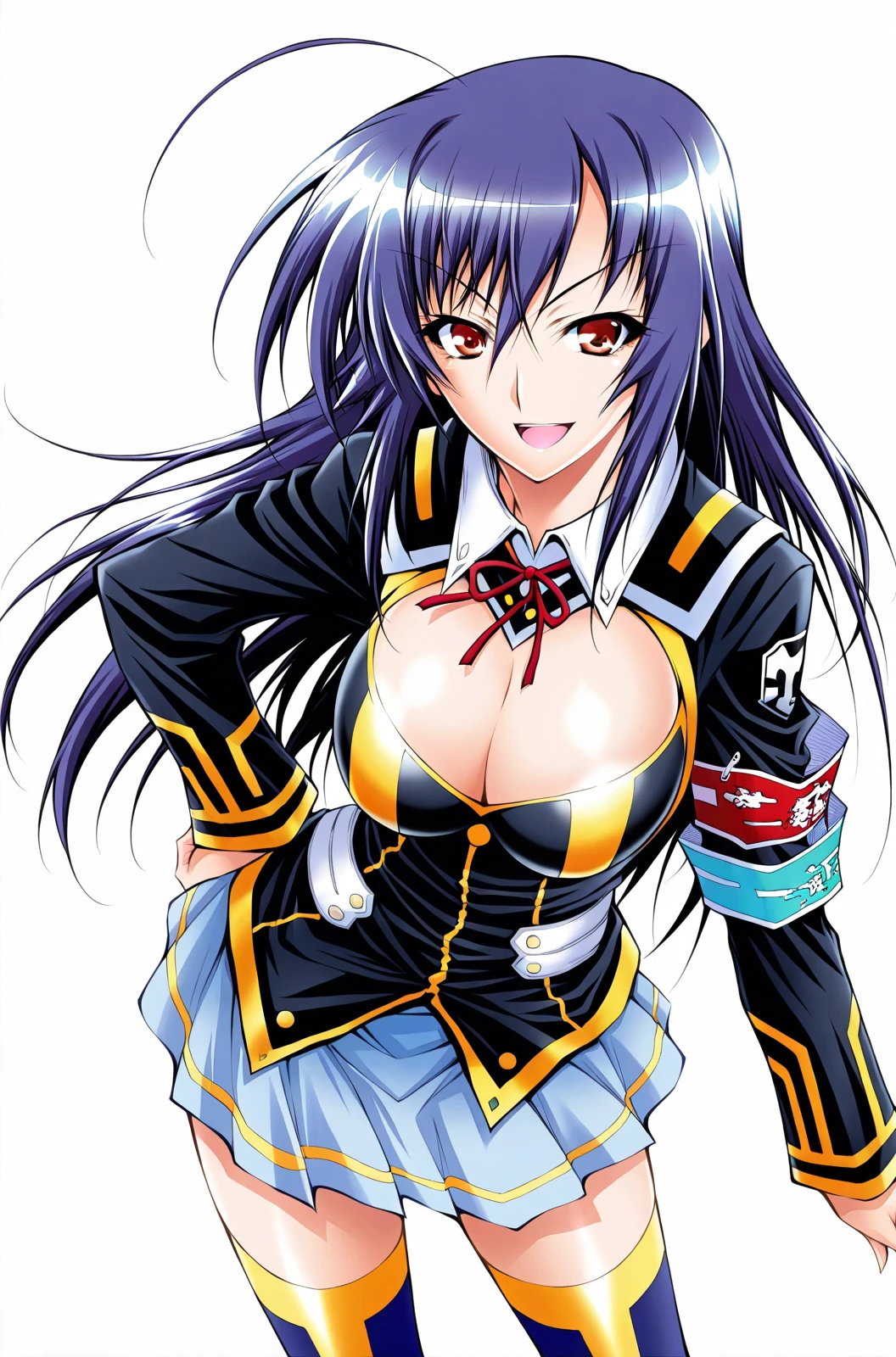 kurokami medaka, 1girl, blue hair, long hair, ahoge, red eyes, school uniform, navy blazer, long sleeves, yellow trim, cleavage cutout, armband, light blue skirt, blue thighhighs,