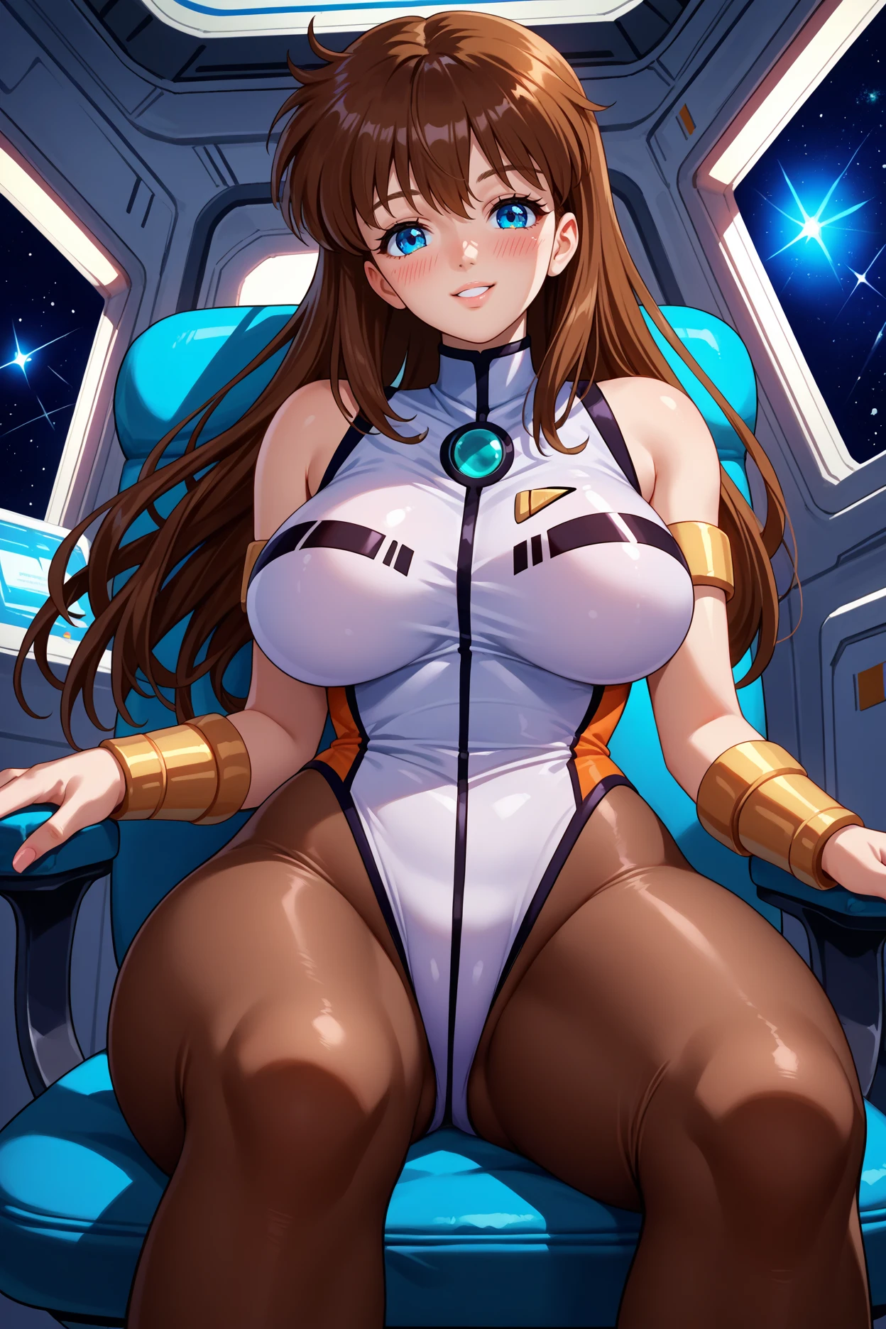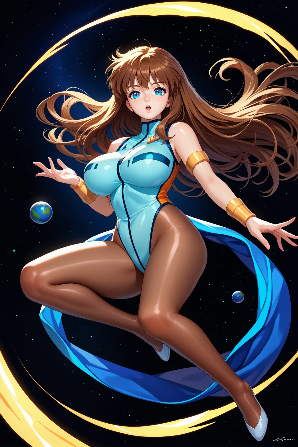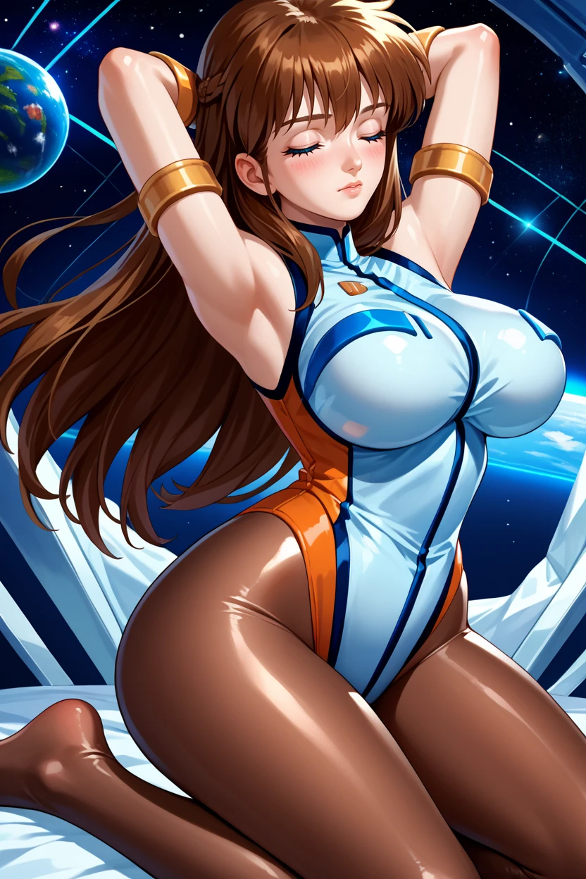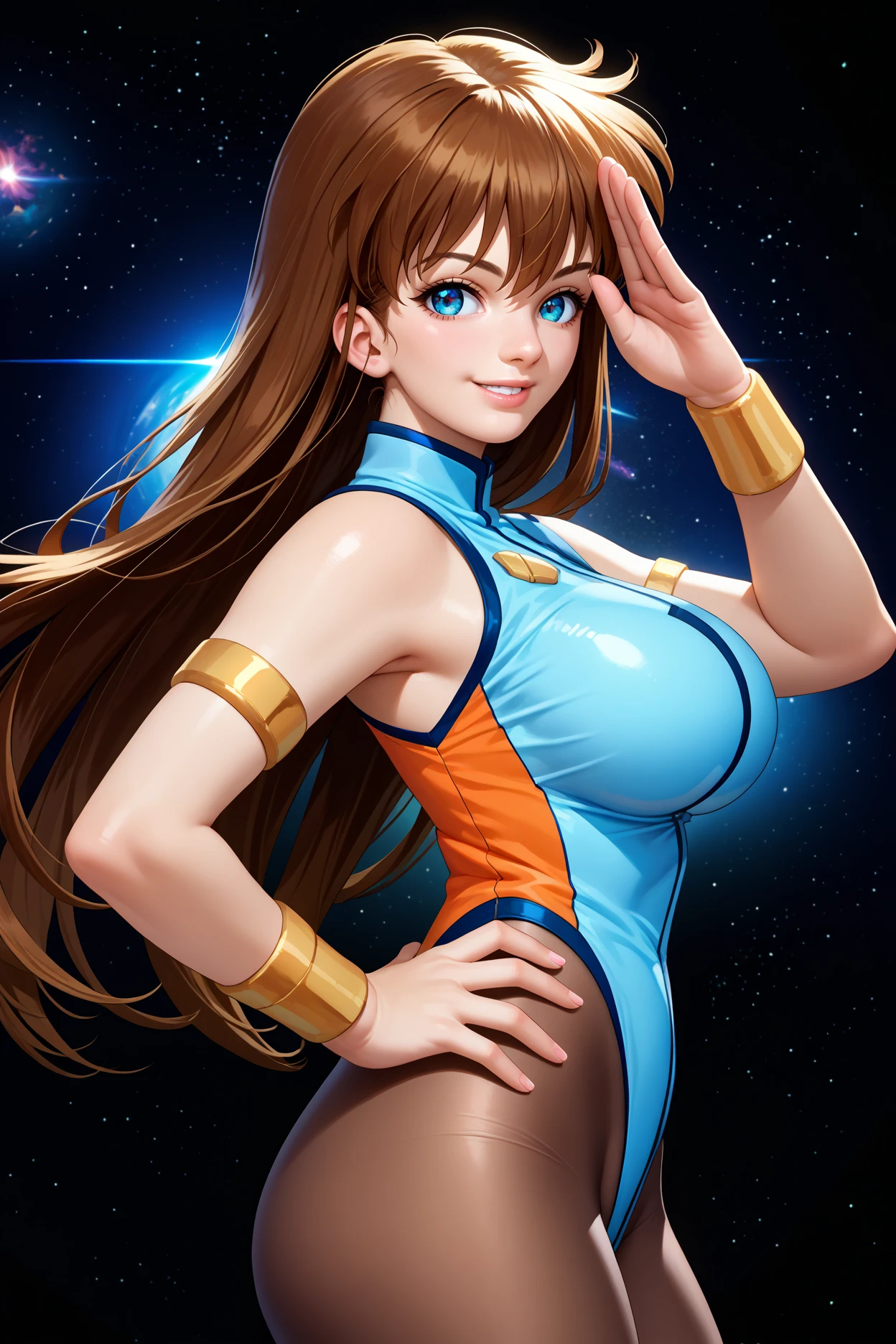 Add "white leotard, sleeveless, pantyhose, armlet, bracer" for her typical look.