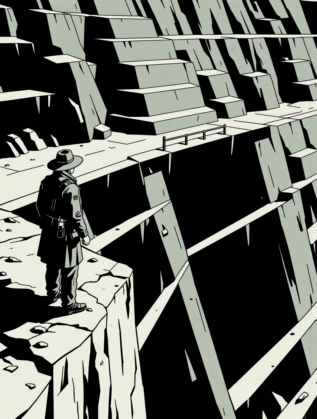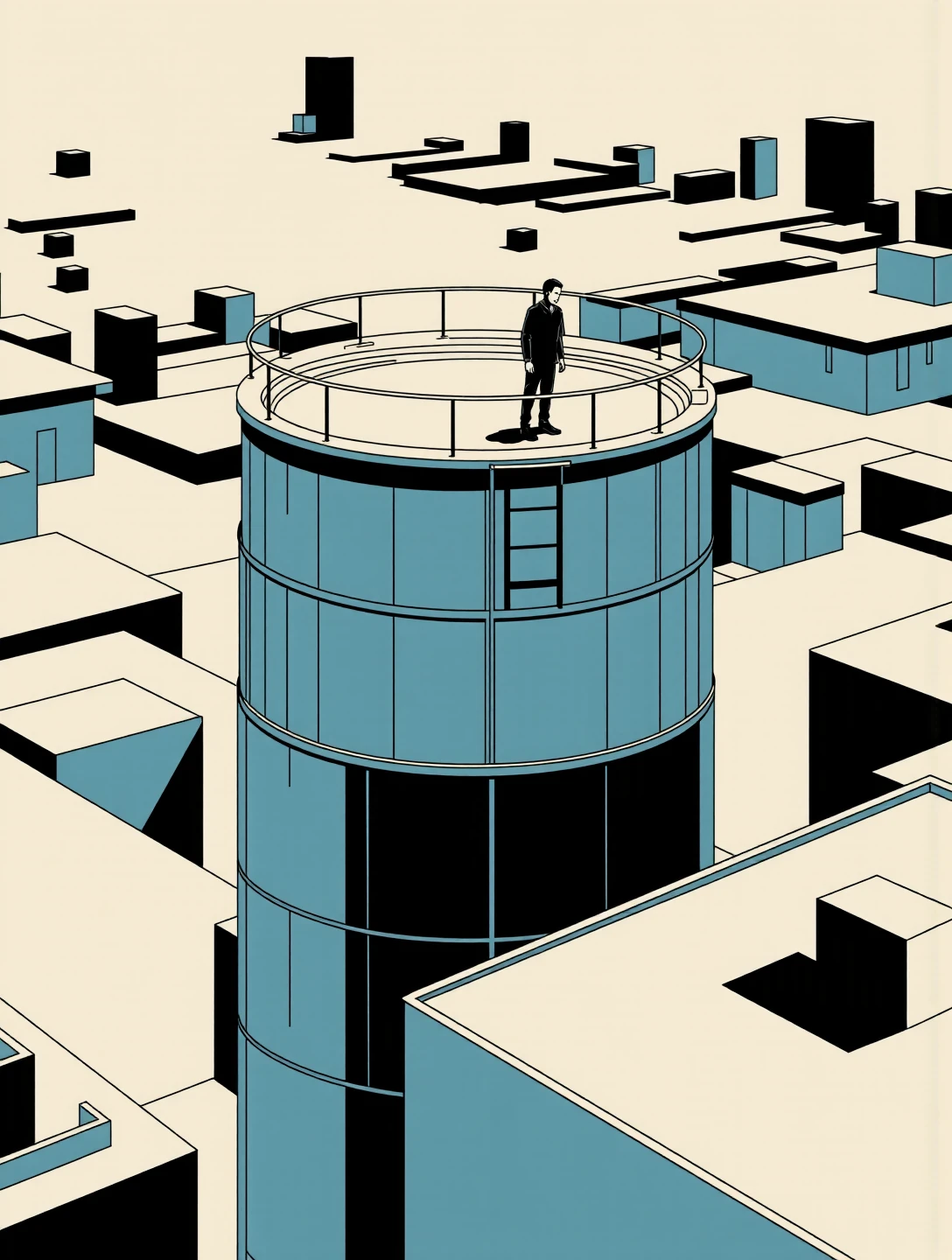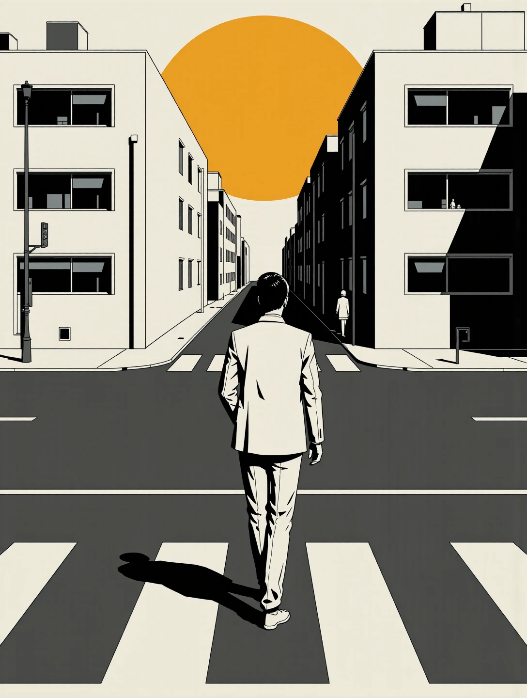 This variant strips the Nano Alcohol language down to structure and negative space. It uses simplified geometry, restrained linework, and broad flat colour fields with carefully managed tonal contrast. Figures are reduced to calm silhouettes or lightly modelled forms, and environments are architectural first: corridors, bridges, plazas, tunnels. Emotion comes from scale, spacing, and direction rather than expression or lighting drama. It excels at isolation, contemplation, transit, and quiet authority, scenes where composition does the storytelling and nothing is allowed to be decorative unless it serves balance or rhythm