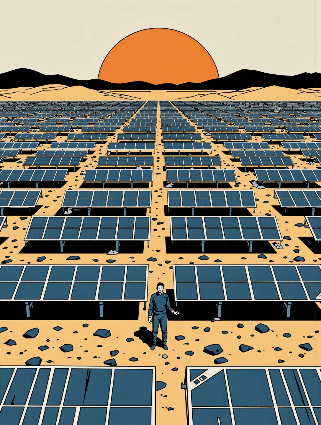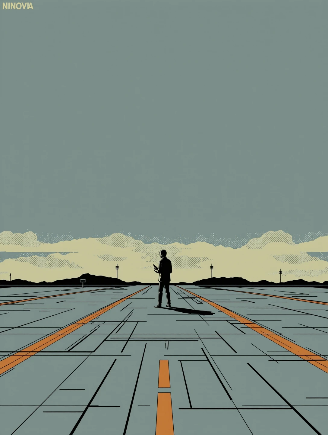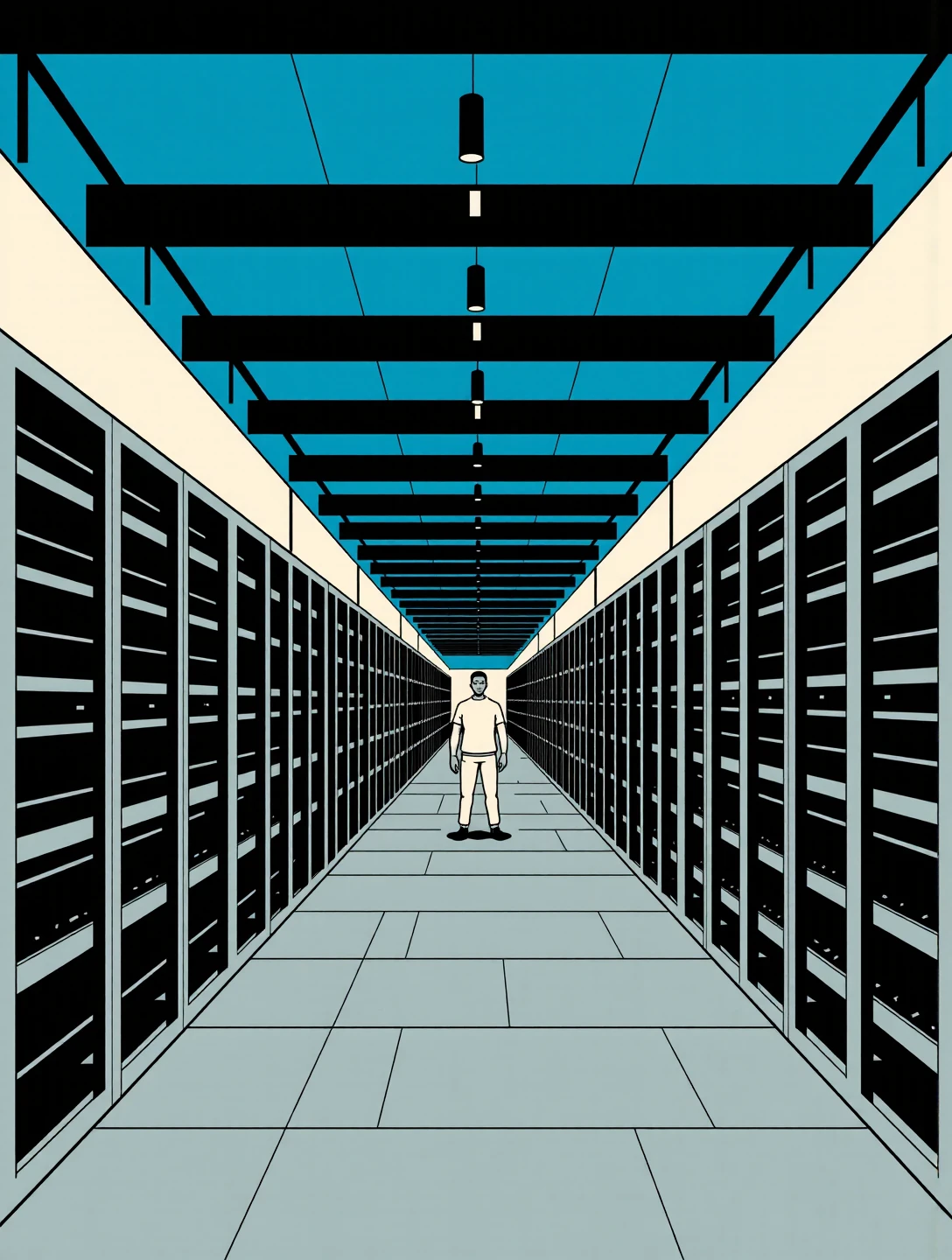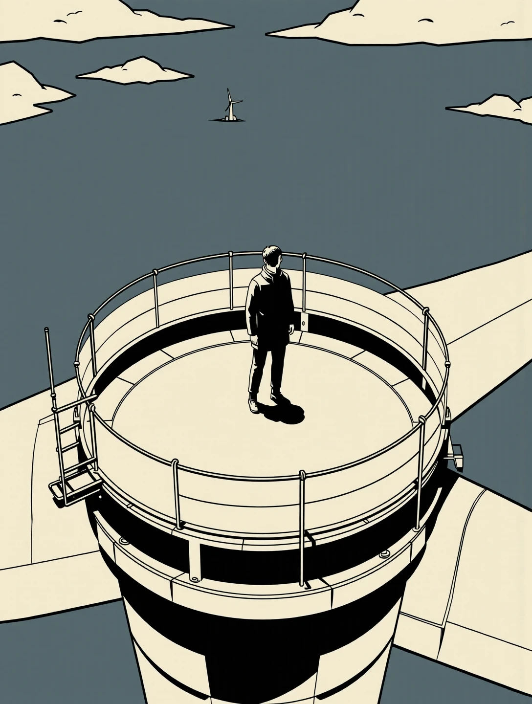 This variant strips the Nano Alcohol language down to structure and negative space. It uses simplified geometry, restrained linework, and broad flat colour fields with carefully managed tonal contrast. Figures are reduced to calm silhouettes or lightly modelled forms, and environments are architectural first: corridors, bridges, plazas, tunnels. Emotion comes from scale, spacing, and direction rather than expression or lighting drama. It excels at isolation, contemplation, transit, and quiet authority, scenes where composition does the storytelling and nothing is allowed to be decorative unless it serves balance or rhythm