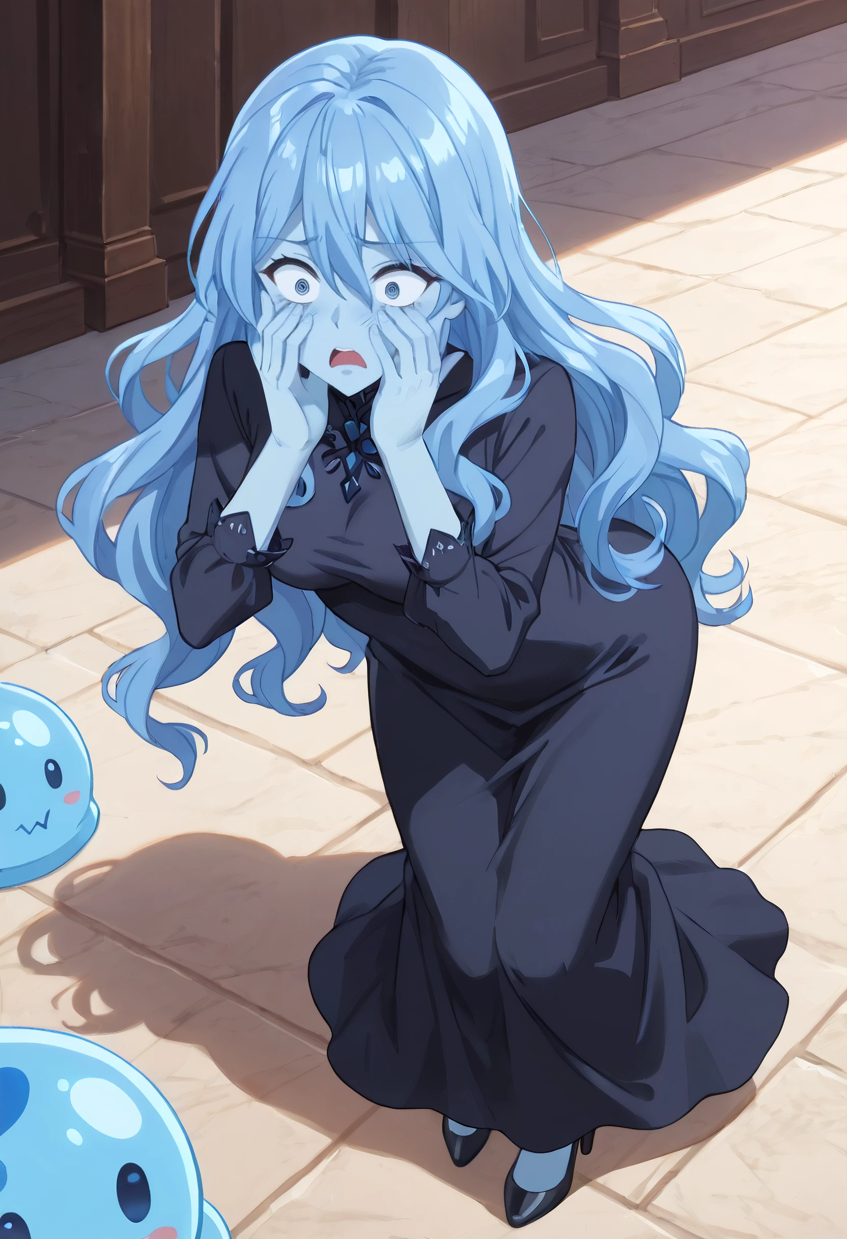 BYNZero, slime girl, blue hair, long hair, very long hair, bangs, hair between eyes, hair censor, hair over breasts, wavy hair, , breasts, colored skin, blue skin,