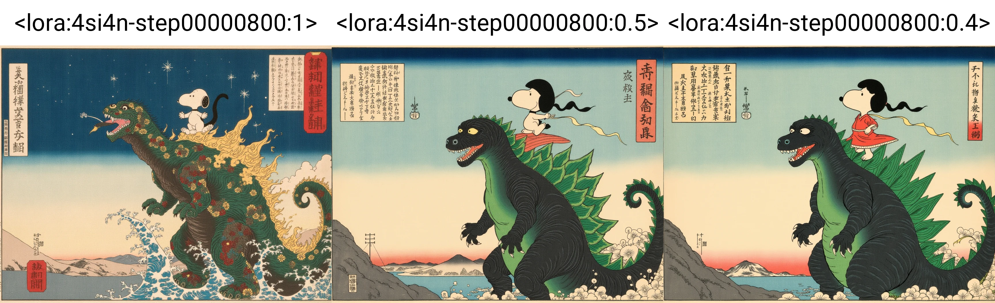 Example: <lora:4si4n-step00000800:1> 4si4n, It depicts a scene of a fight of princess peach fighting bowser, poster from the series Fifty-Three Stations of the Tokaido by Utagawa Kunisada Toyokuni III/Kunisada III. princess peach is holding machine gun, bowser, epic, masterpiece composition, movement,