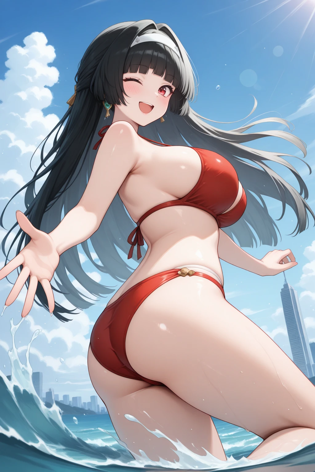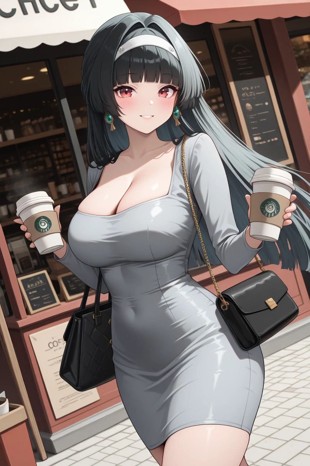 4str4, large breasts, red eyes, black hair, long hair, blunt bangs, hair intakes, white hairband, earrings, bead necklace, pendant