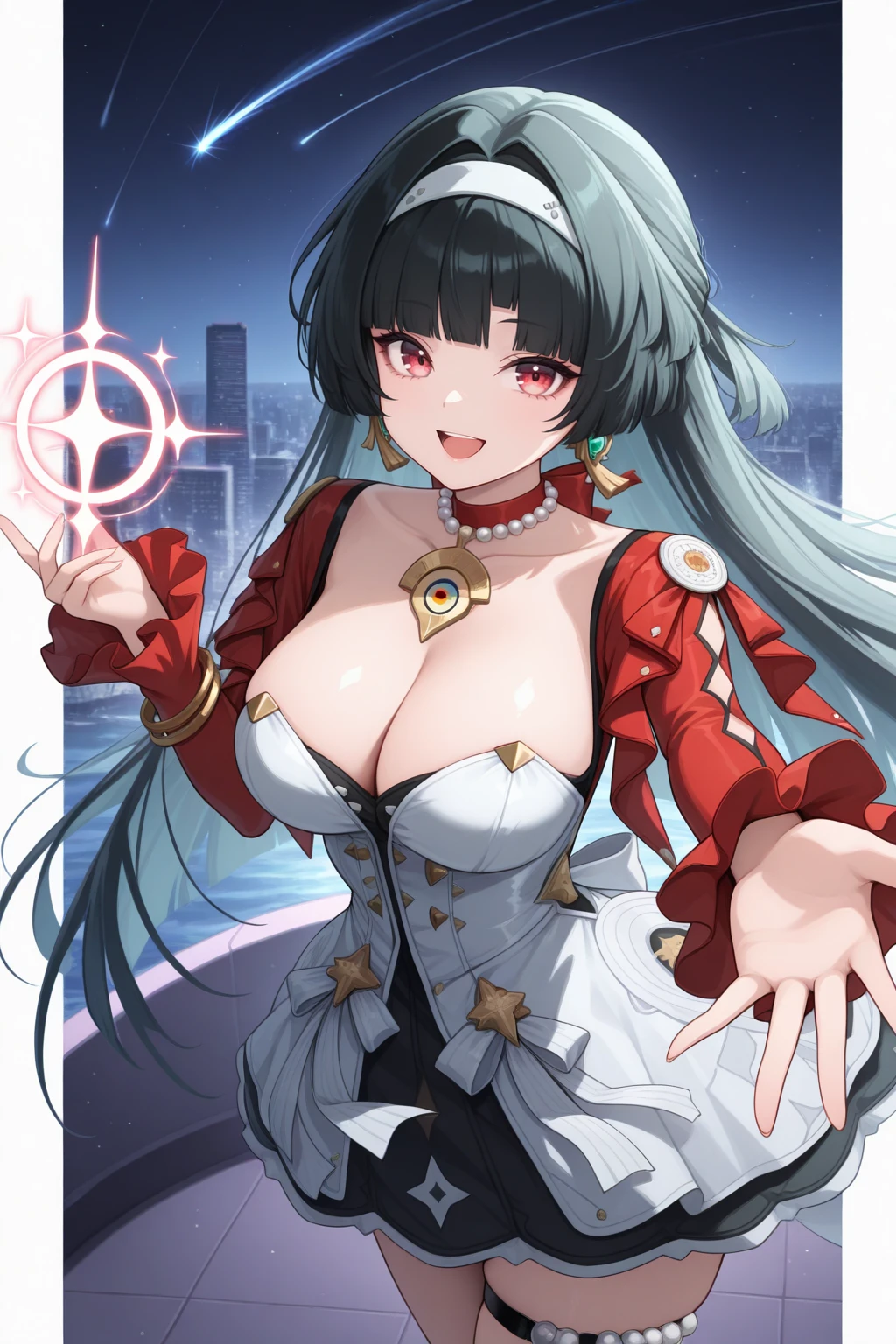 Outfit : red bow choker, red shrug, collarbone, cleavage, frilled sleeves, long sleeves, two-tone dress, white dress, black dress, dress ribbon, star ornament, bracelet, thigh strap