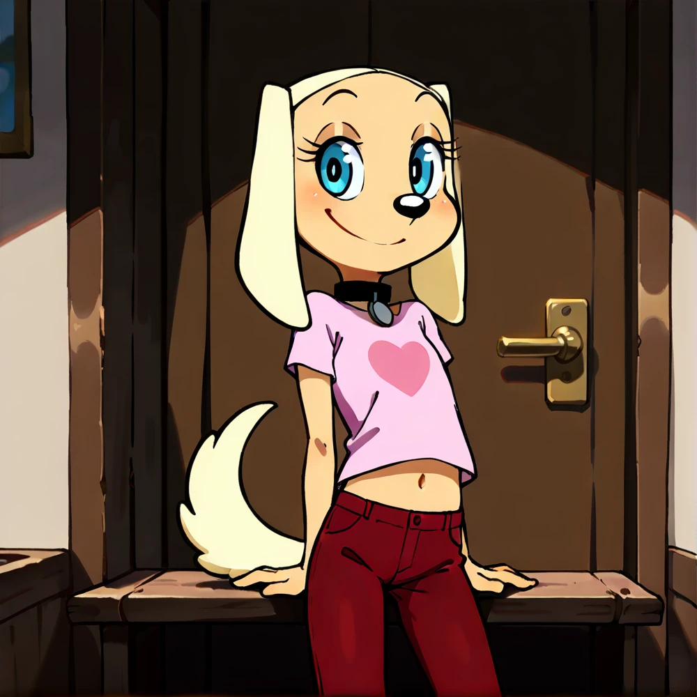 brandy_h, dog ears, animal nose, female, furry, blond hair, dog tail, blue eyes, pink shirt, midriff, red pants