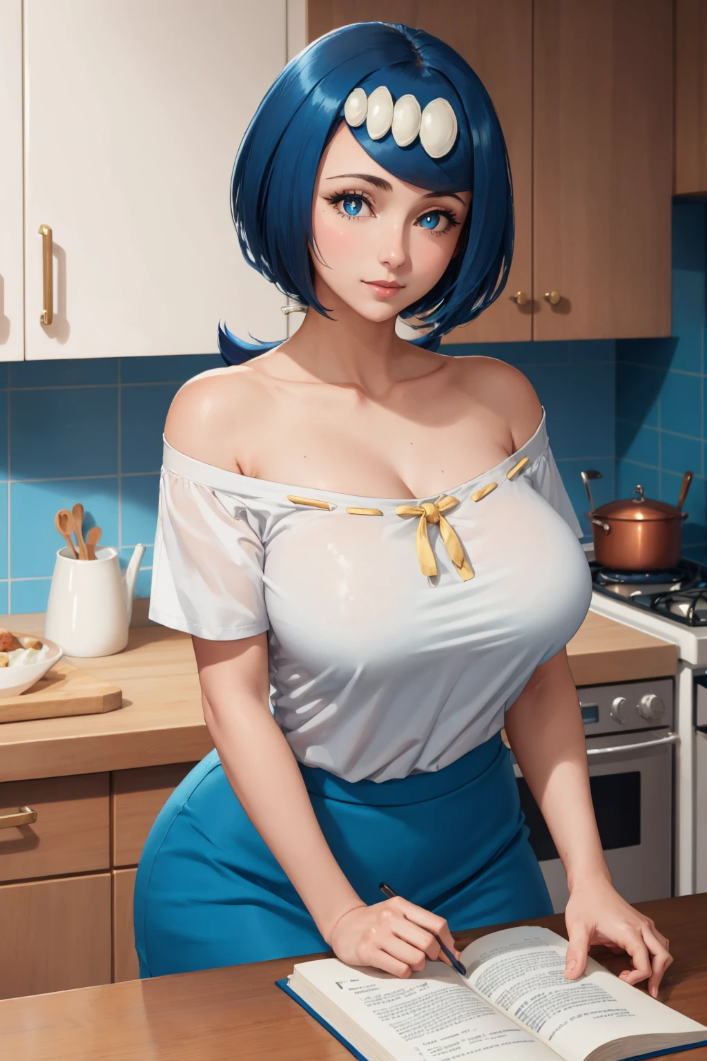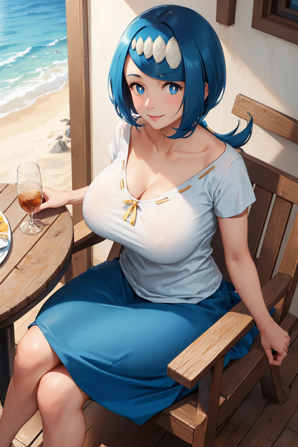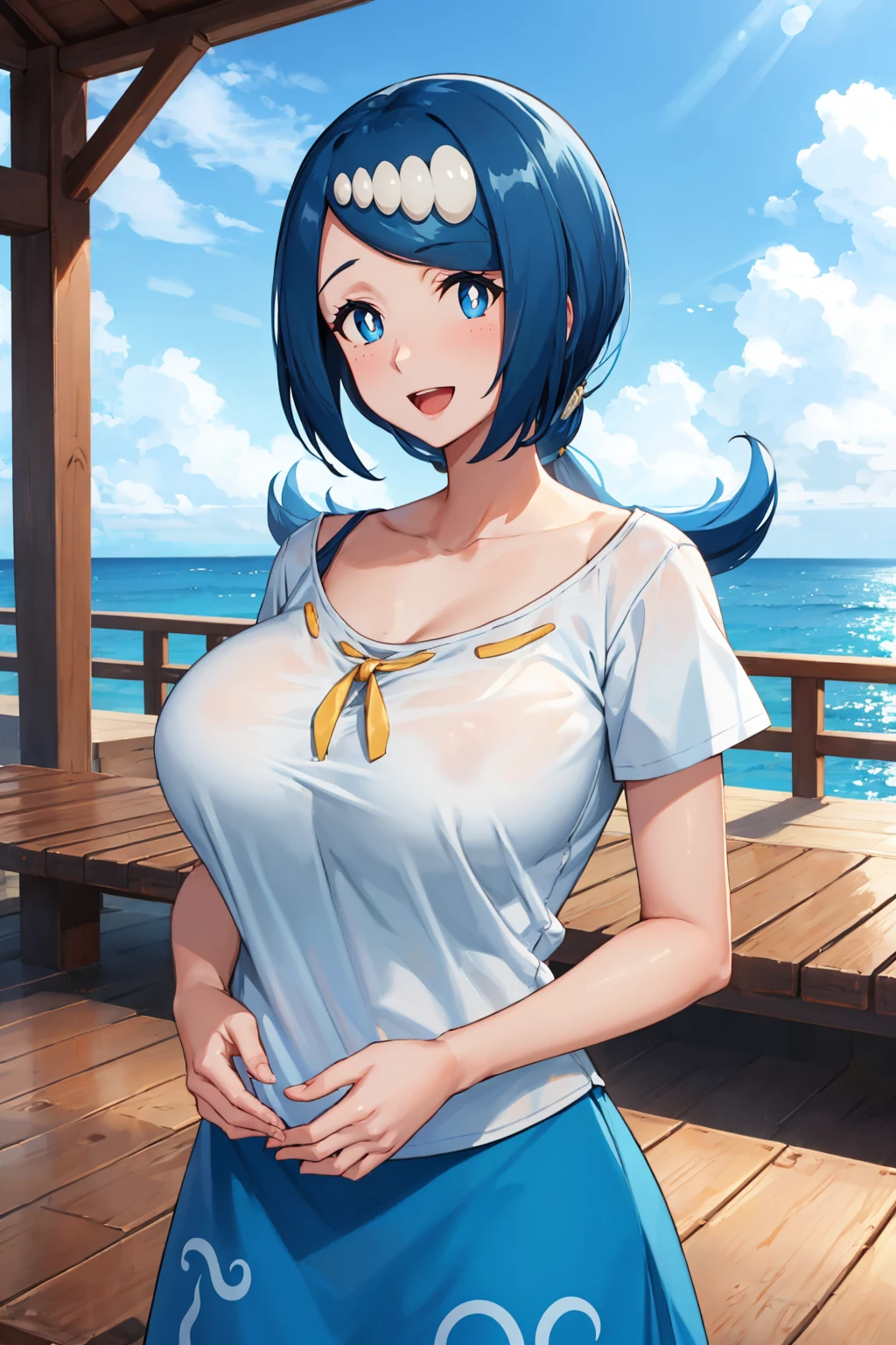 hair ornament, shirt, short sleeves, blue and white skirt