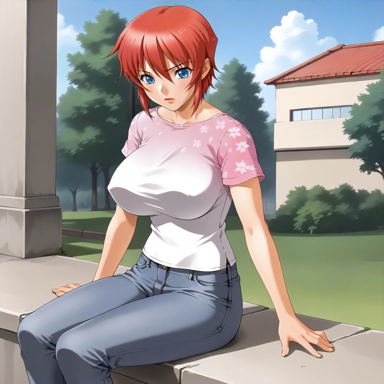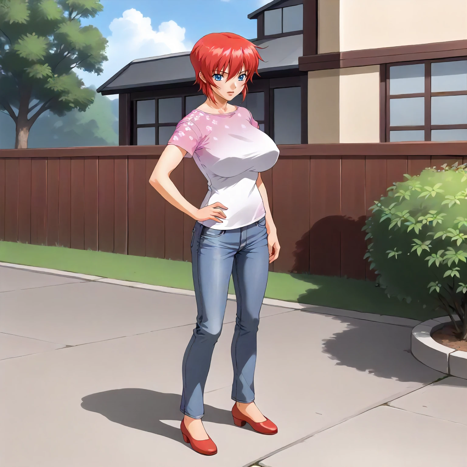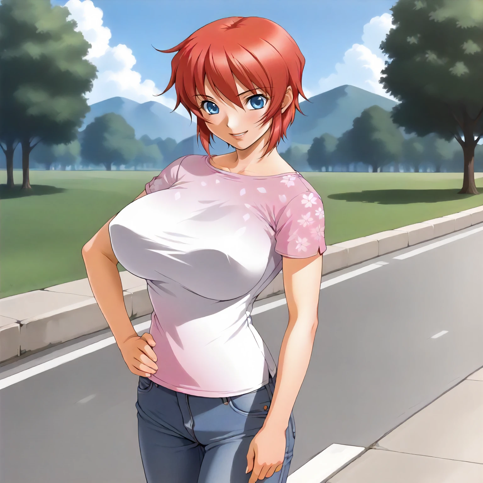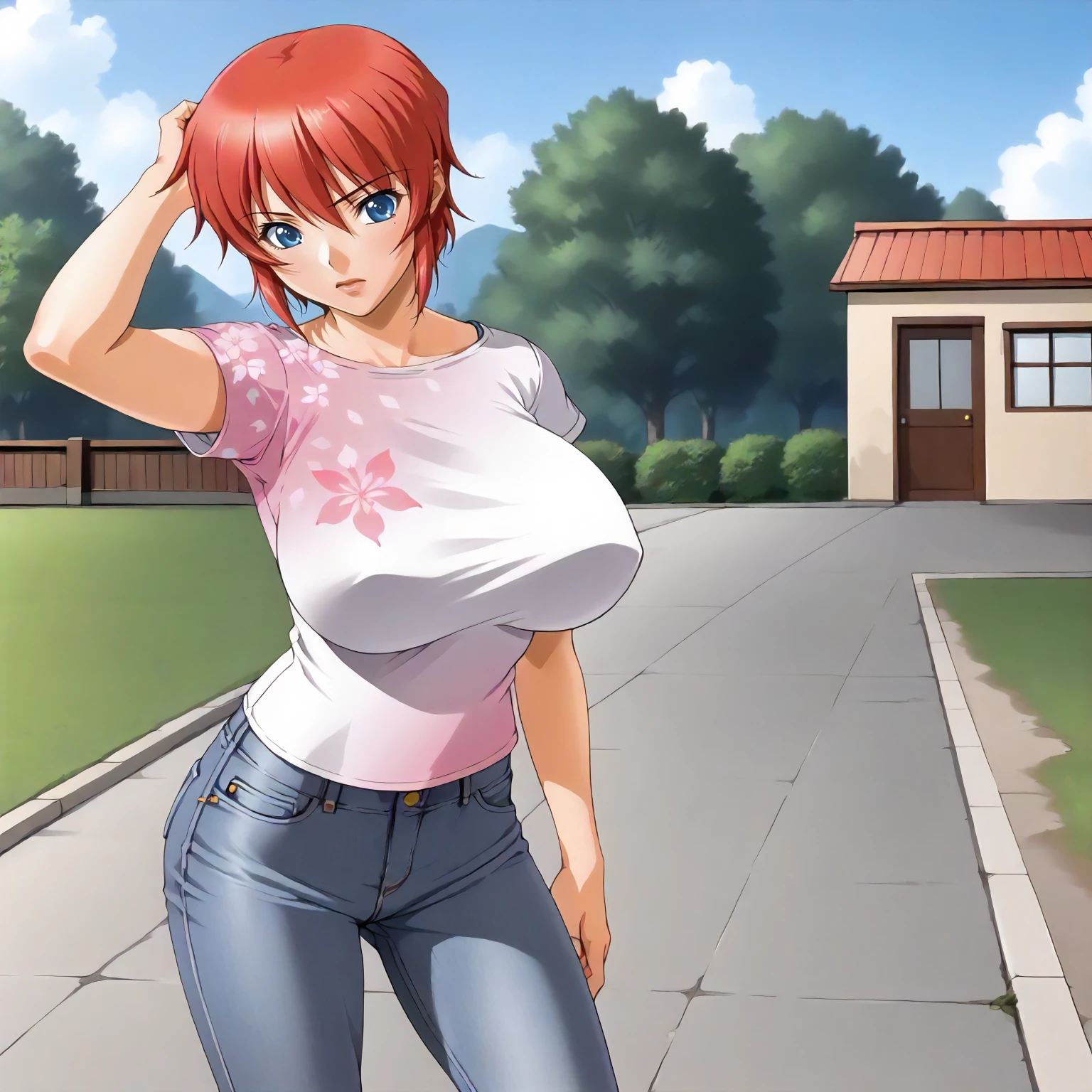 AnneHanamaru,1girl,red hair,short hair,blue eyes, large breasts,