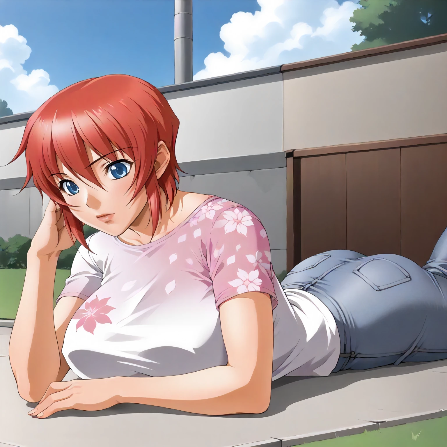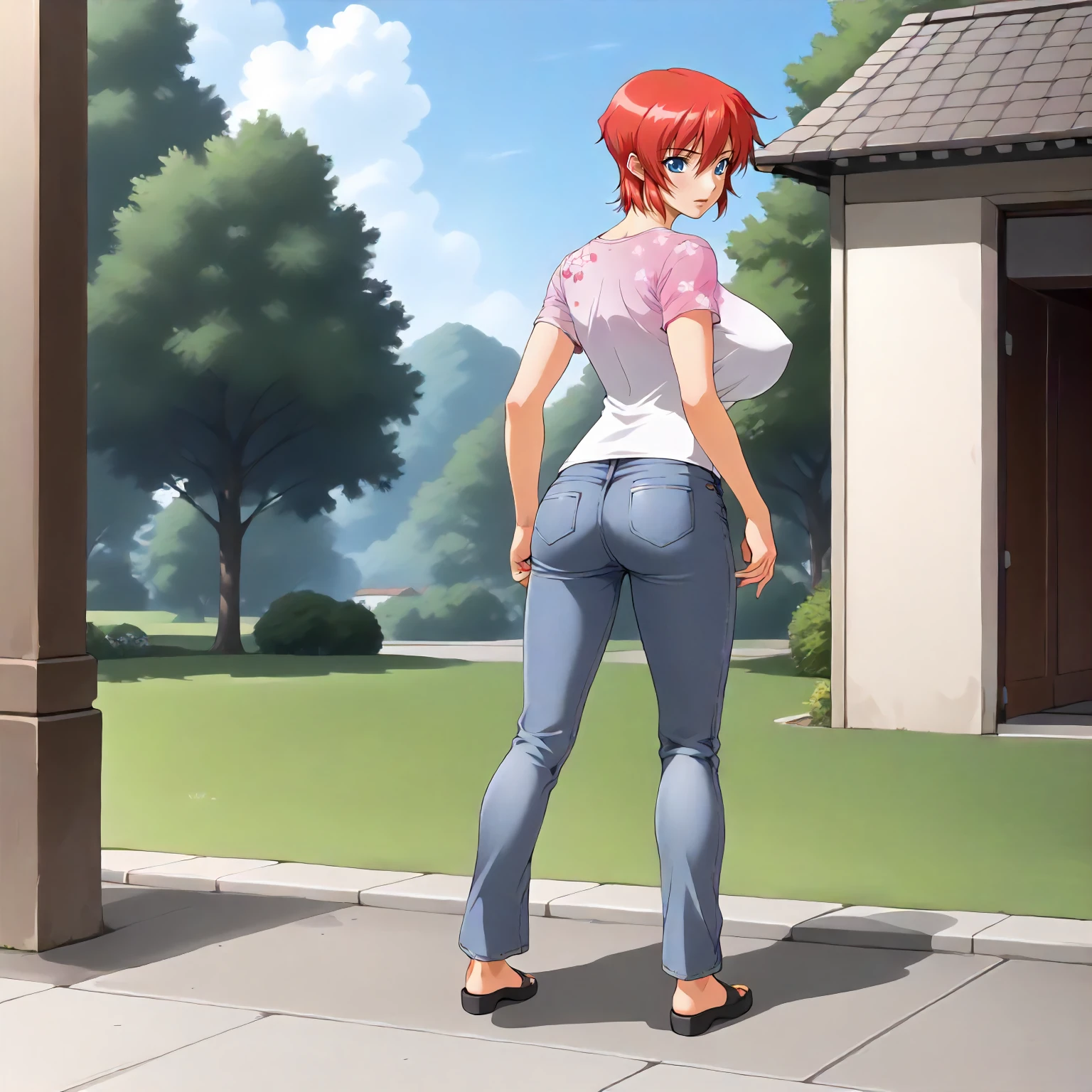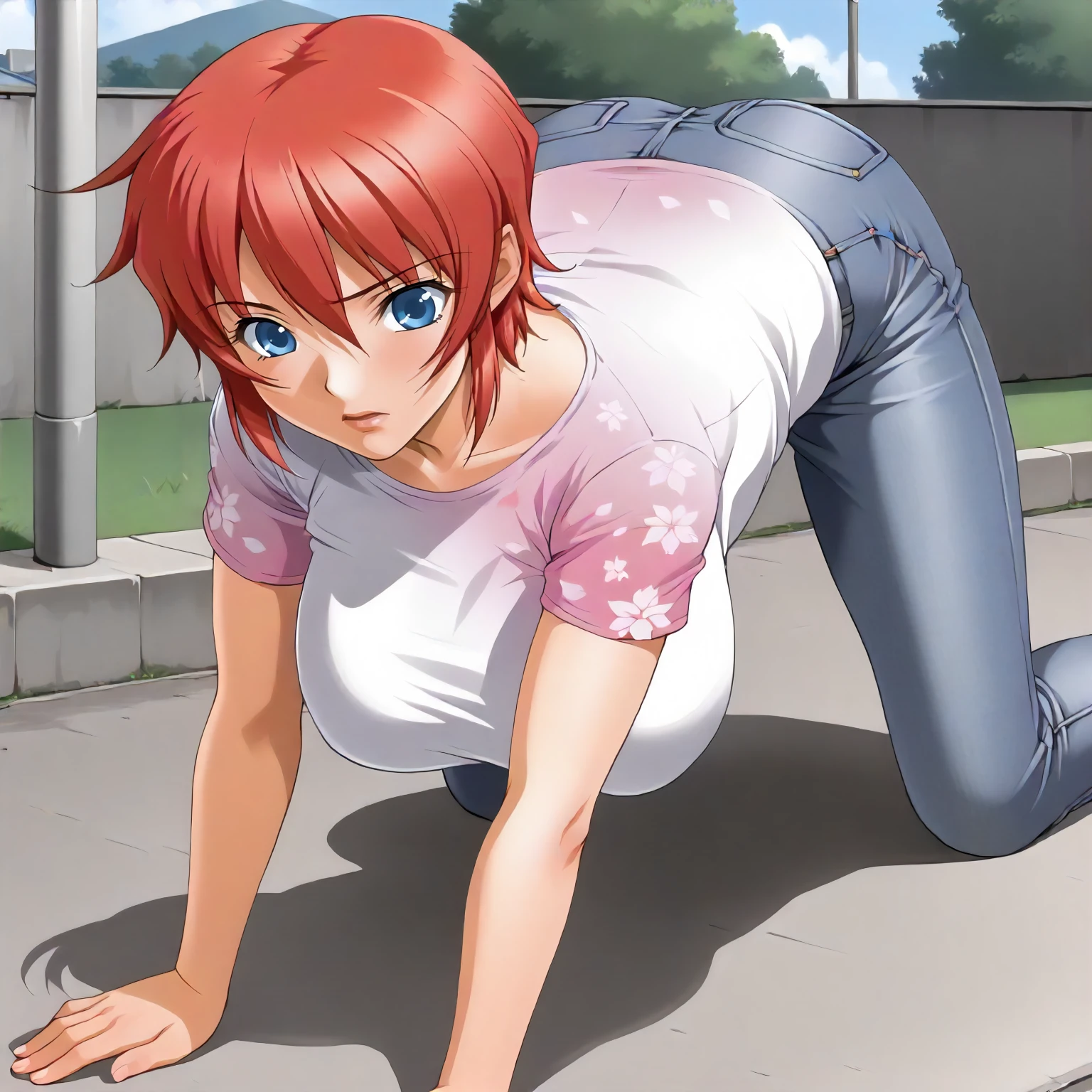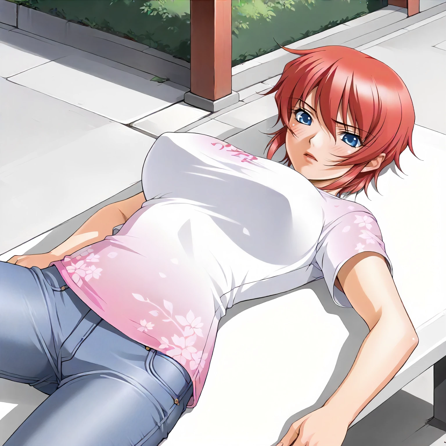 AnneHanamaru,1girl,red hair,short hair,blue eyes, large breasts,