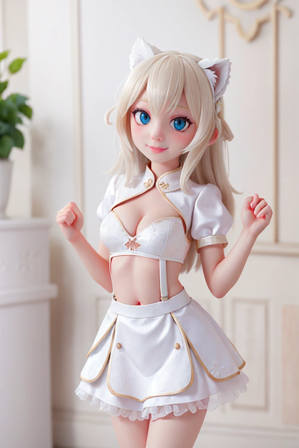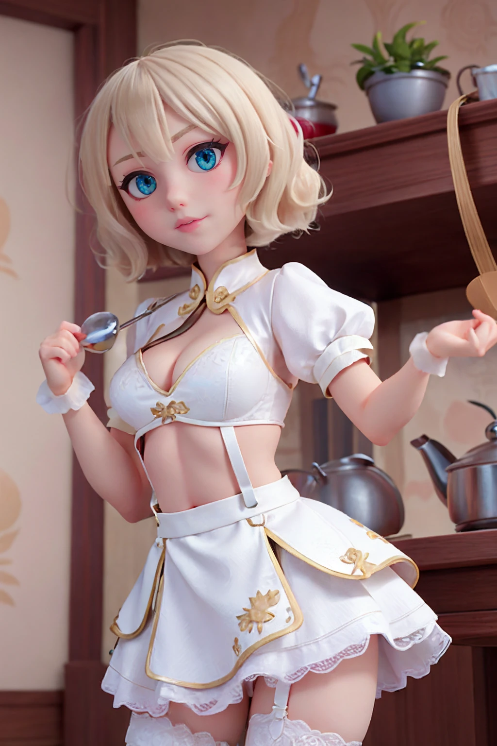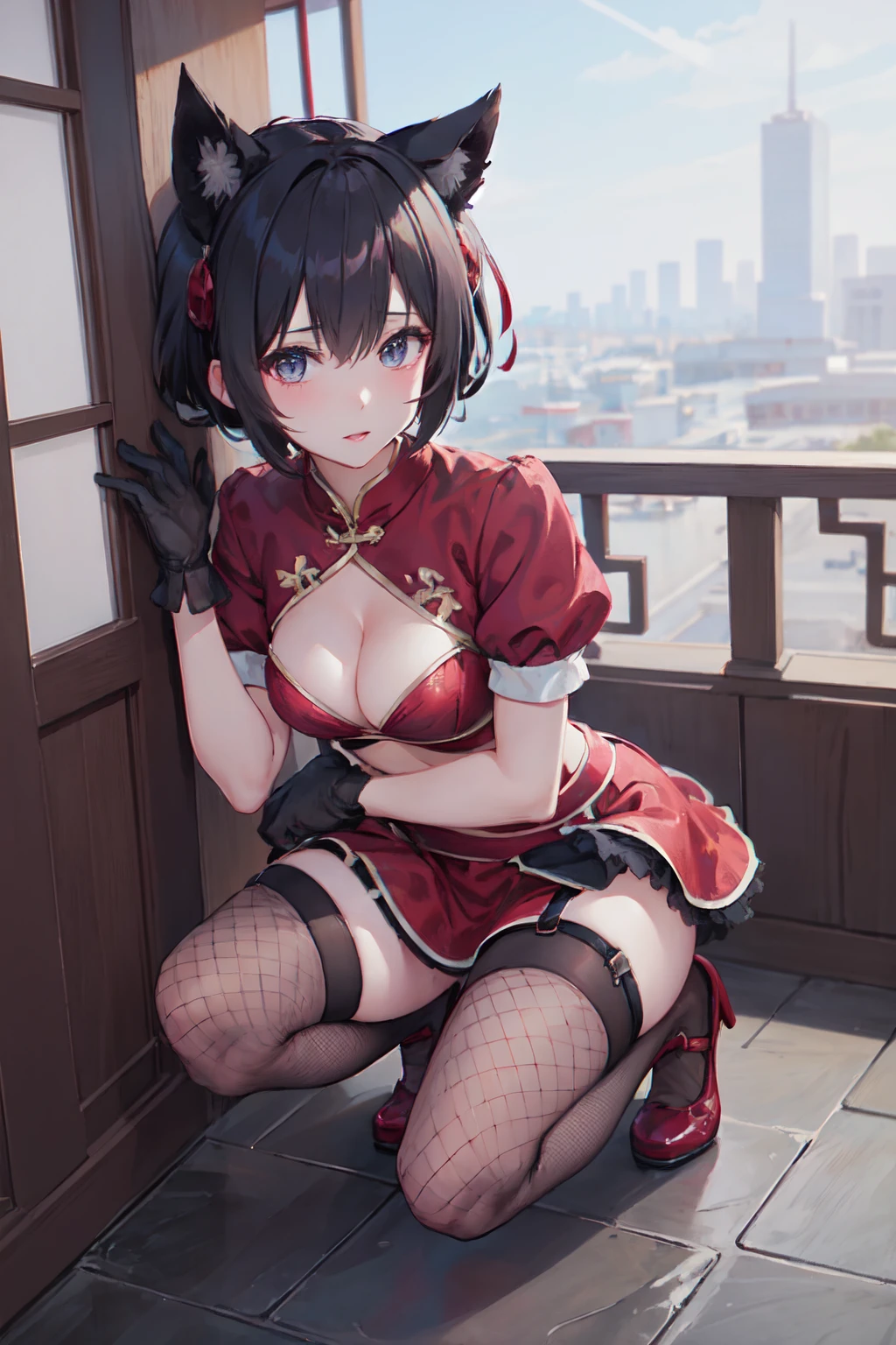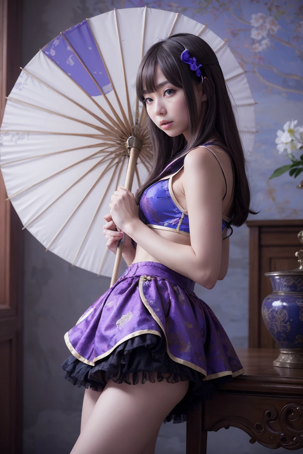 fishnet thighhighs, Thighhighs, lace gloves, hair bun, double bun, garter straps, chair, chinese clothes, fishnets, bun cover, midriff, cleavage cutout, dragon, eastern dragon, kneeling, hair ornament, puffy short sleeves, puffy sleeves, white theme, suspenders, clothing cutout, bangs, skirt lift, hair bow, midriff, umbrella, holding umbrella