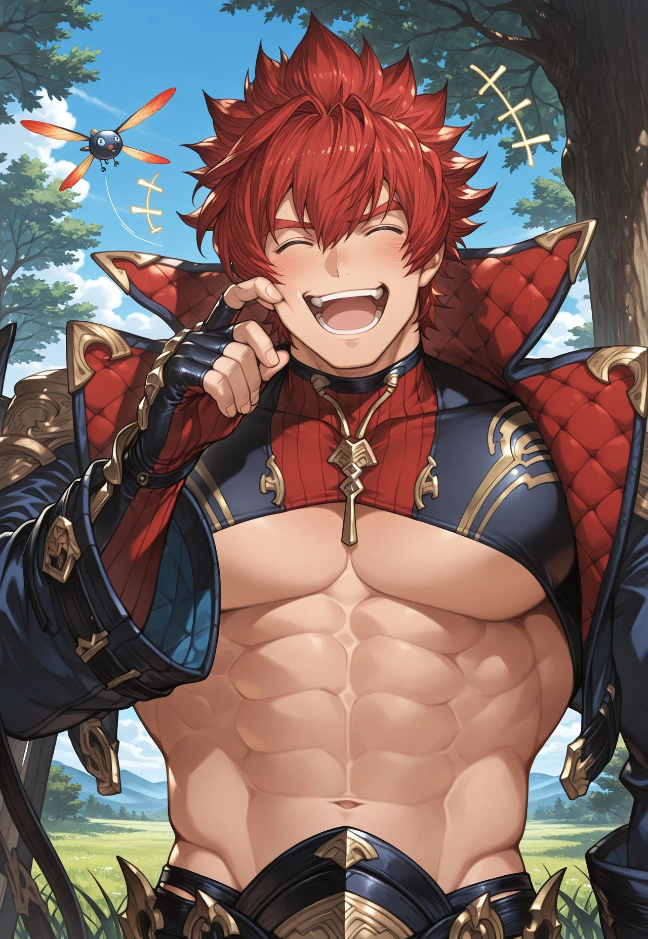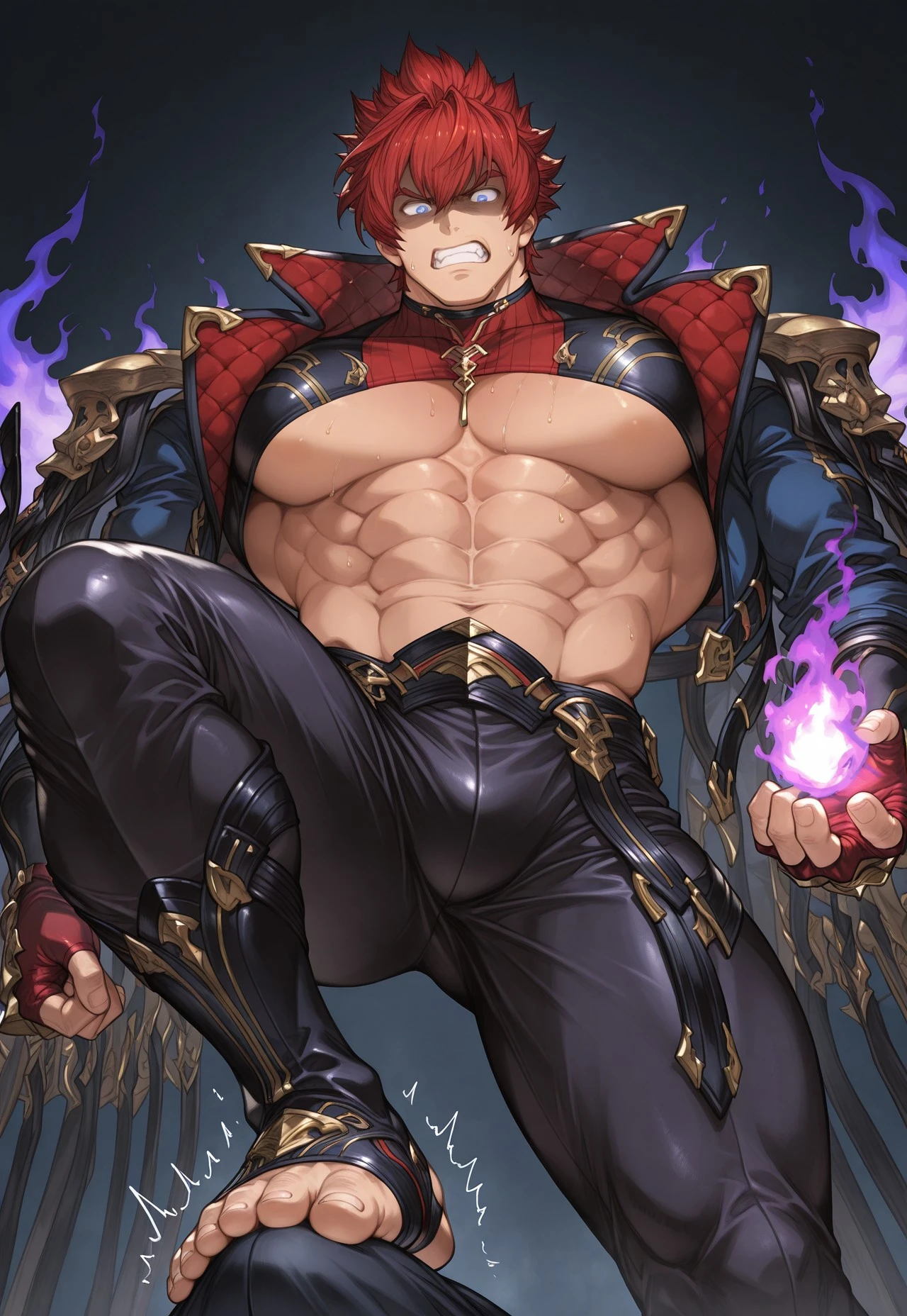 p3ism4, red hair, blue eyes, collared jacket, crop top, shoulder armor, fingerless gloves, black leggings, fauld