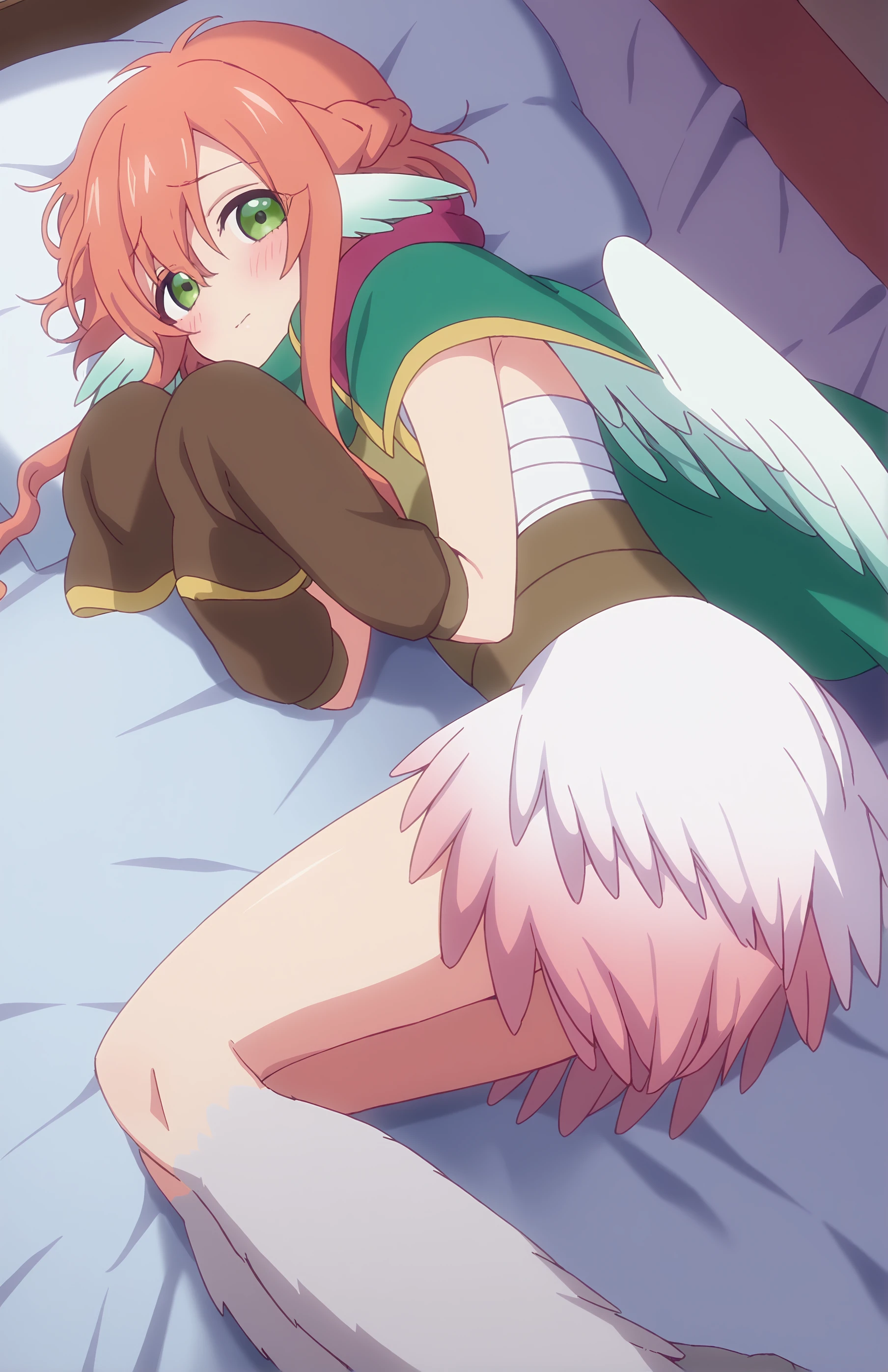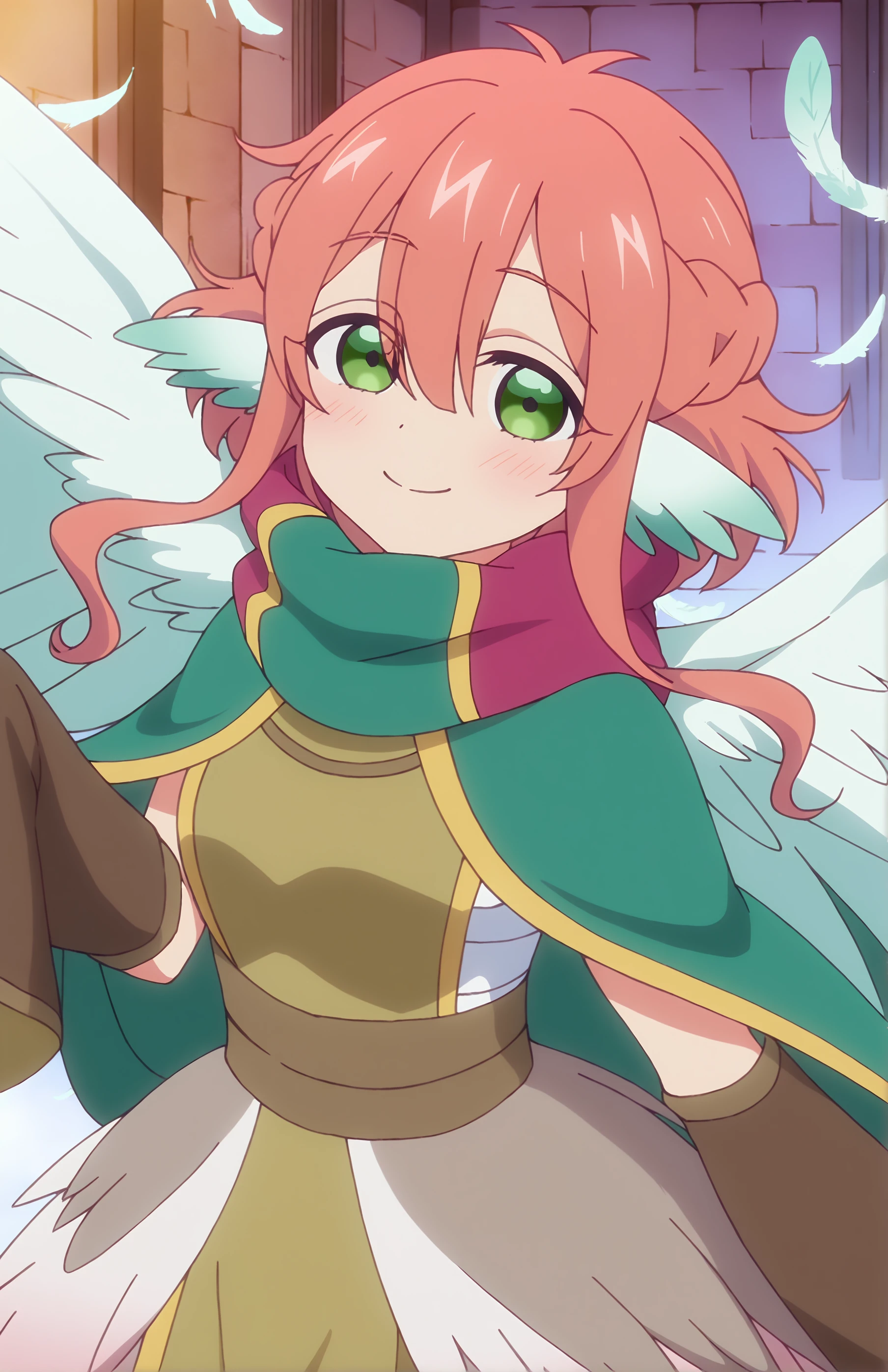 HarpyOya, animal ears, green eyes, wings, cape, orange hair, pink hair, monster girl, bird ears, green scarf, sidelocks, scarf, armor, sleeves past wrists