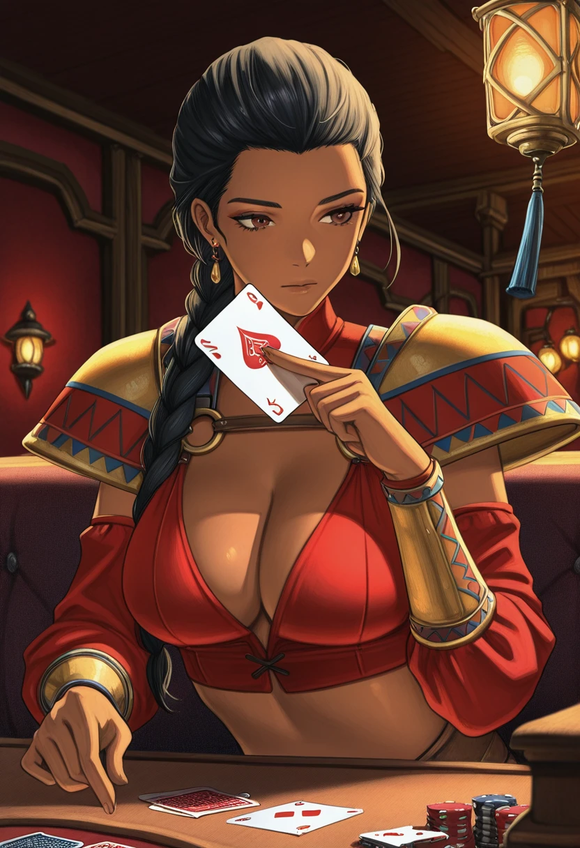 long hair, black hair, braided ponytail, dark skin, brown eyes