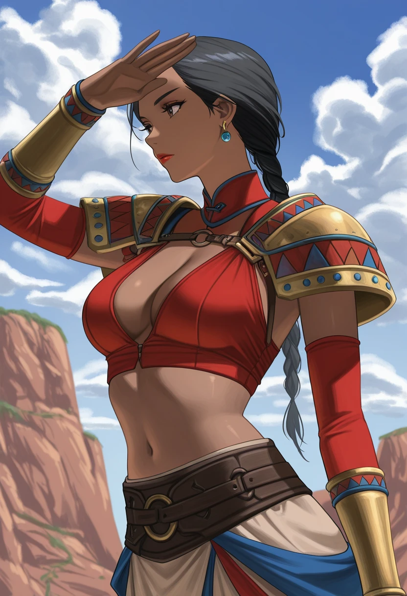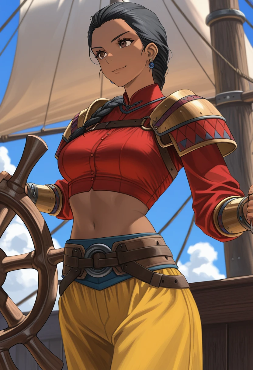 shirt, red shirt, shoulder armor, breasts, bracer, white pants, midriff, navel, belt, knee armor, boots,Classic outfit: