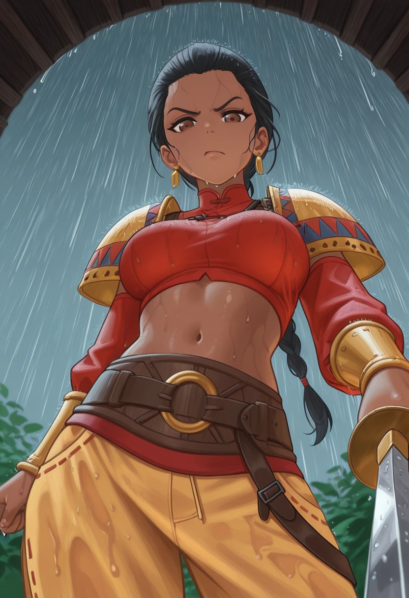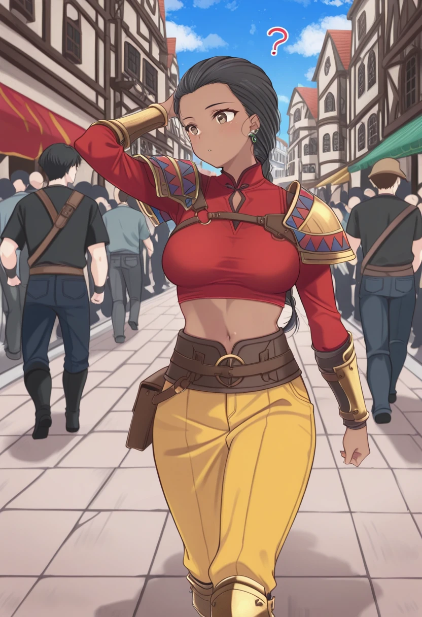 crop top, cleavage, detached sleeves, breasts, bracer, yellow pants, midriff, navel, belt, knee armor, boots,Description