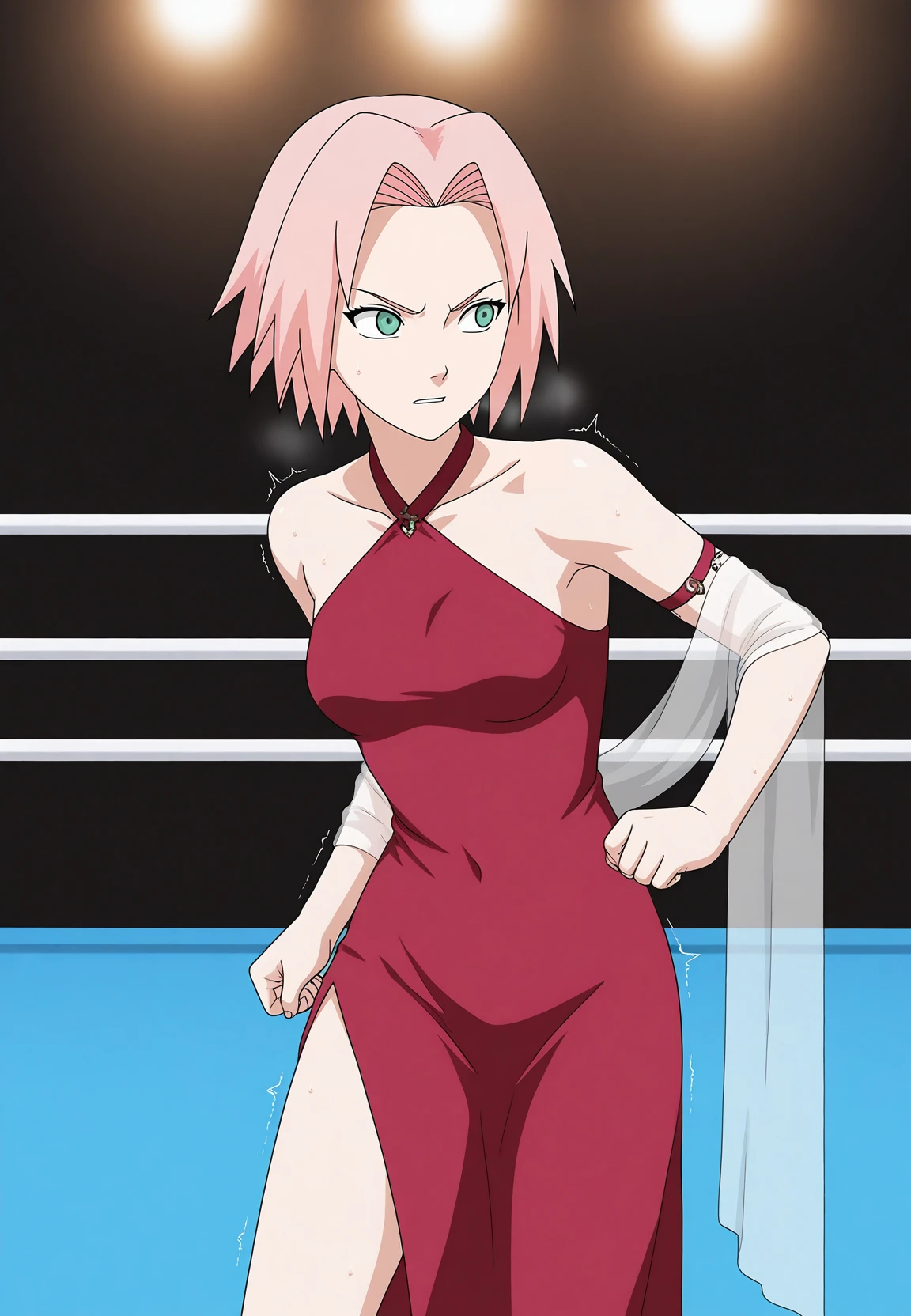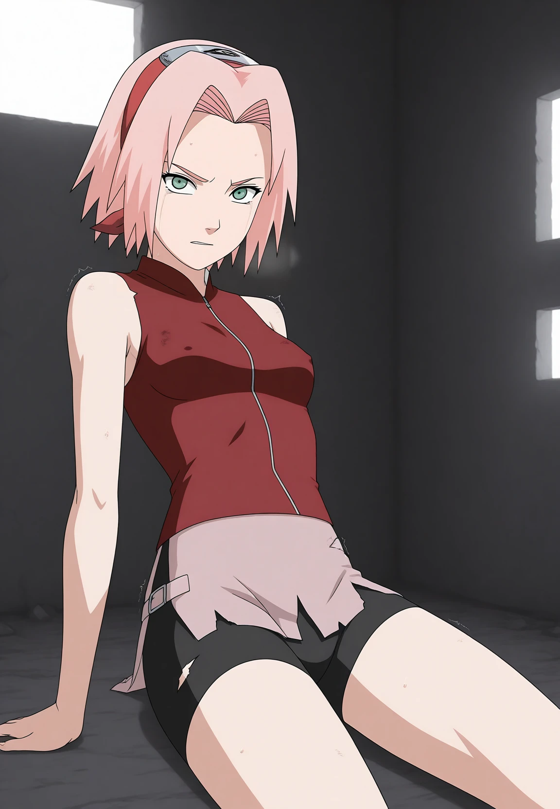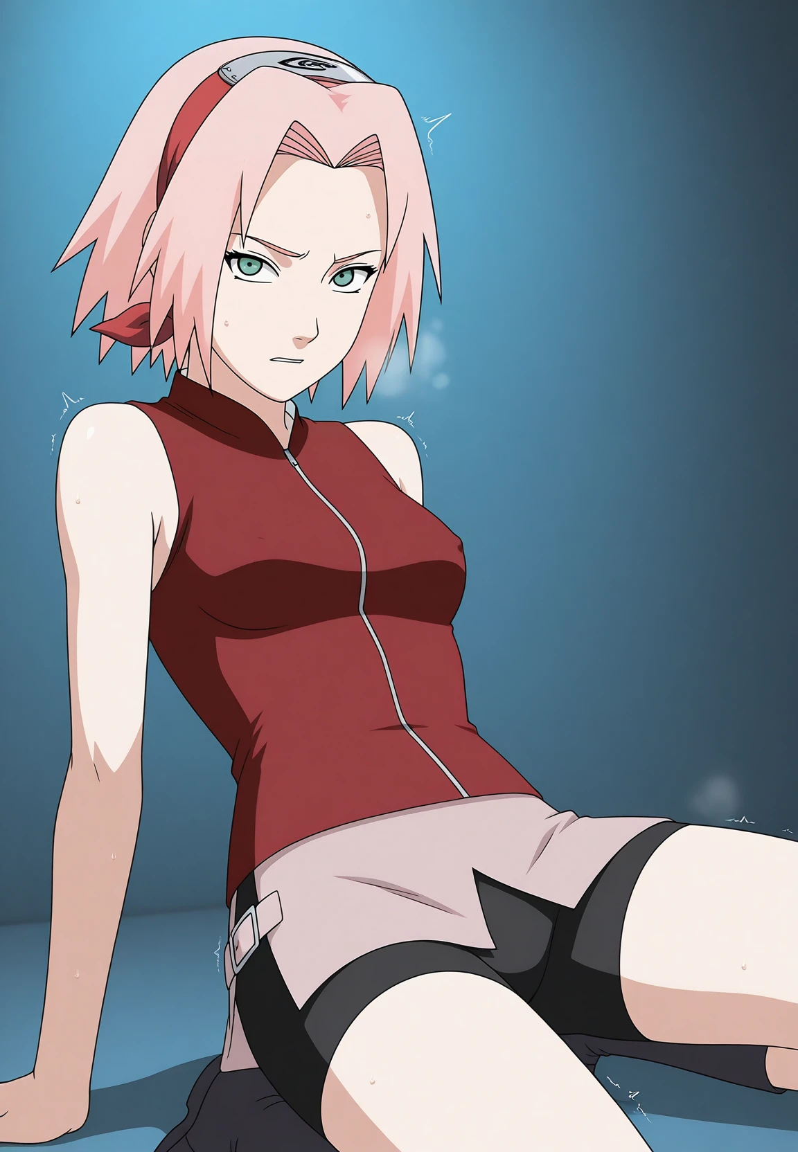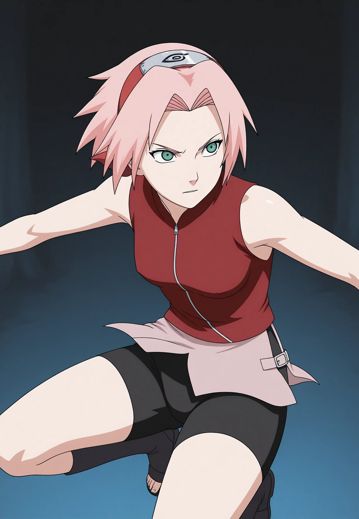 anime screenshot,anime coloring,chunyeying,haruno sakura,1girl,solo,pink hair,short hair,forehead protector,konohagakure symbol,red hairband,green eyes,small breasts,