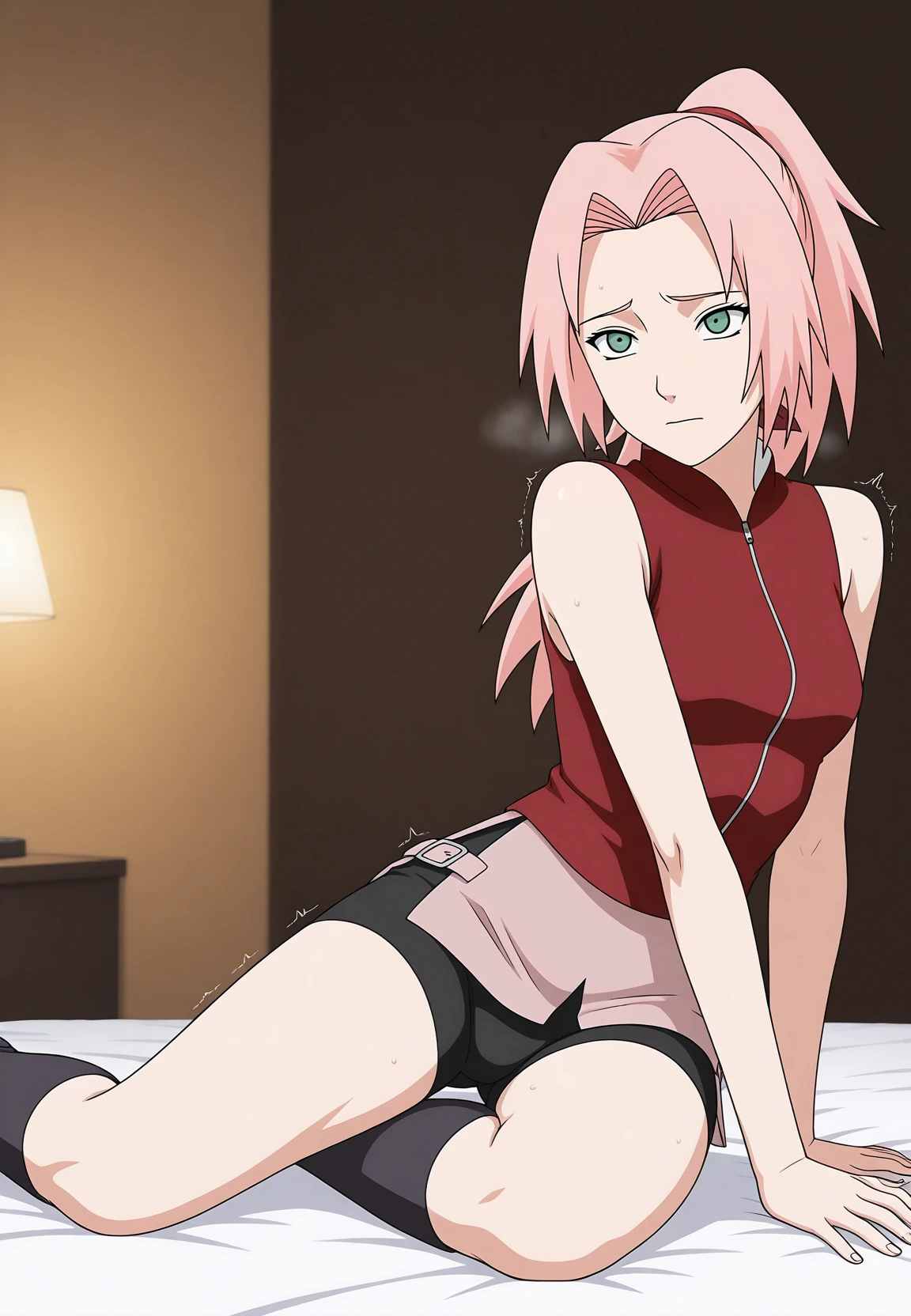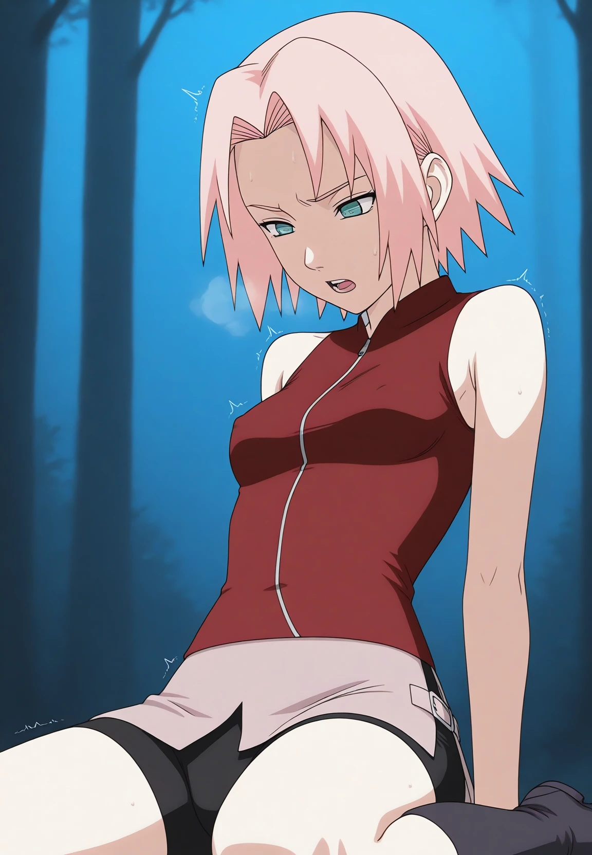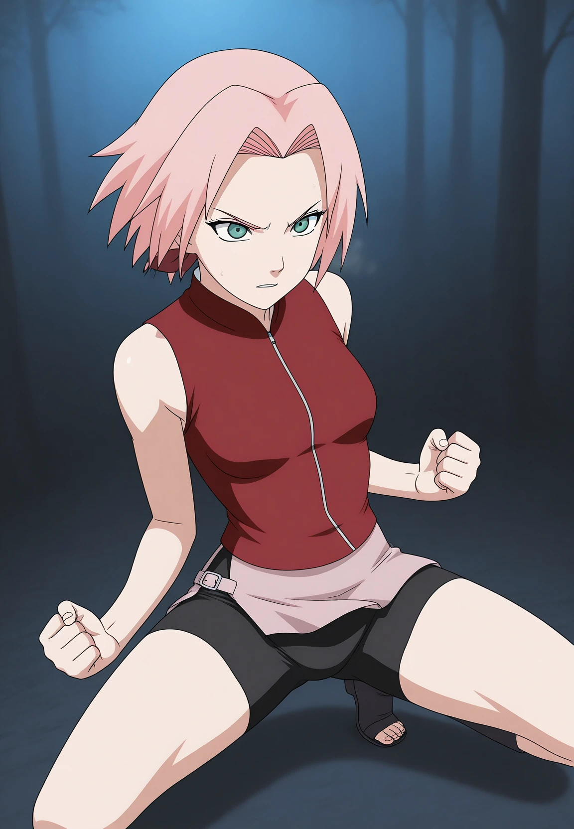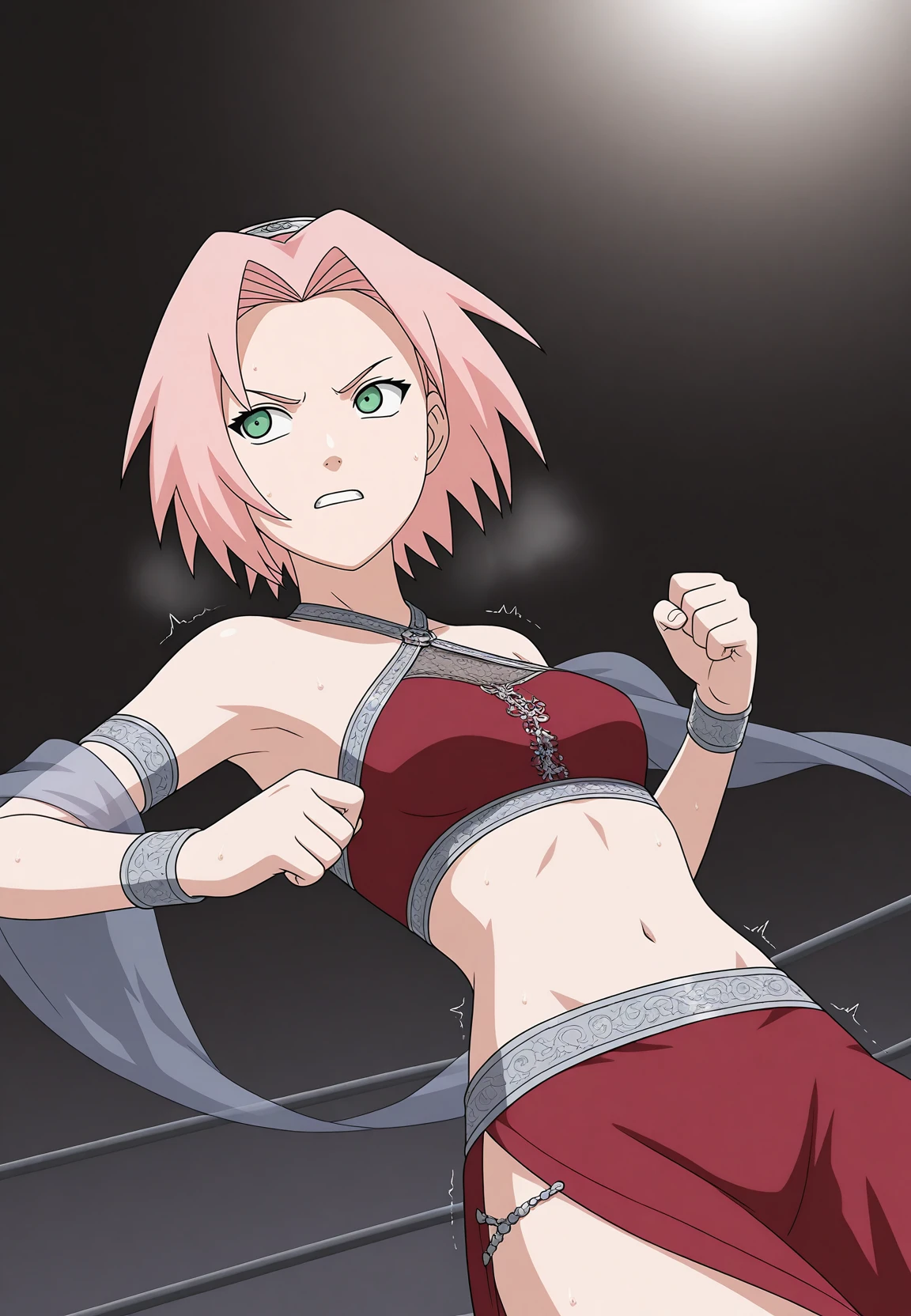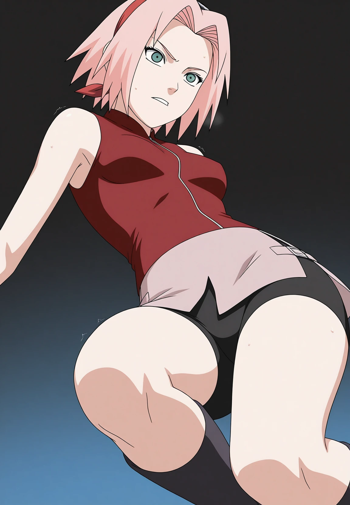 anime screenshot,anime coloring,chunyeying,haruno sakura,1girl,solo,pink hair,short hair,forehead protector,konohagakure symbol,red hairband,green eyes,small breasts,