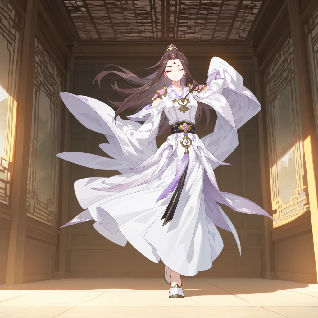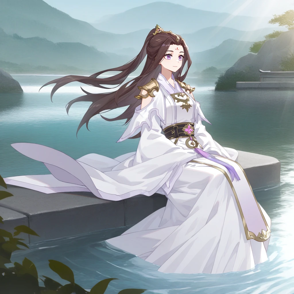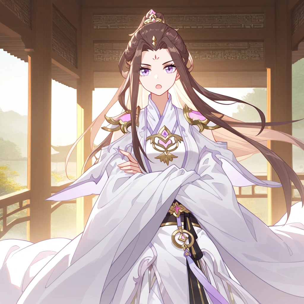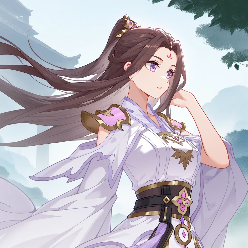 LiQingchan, brown hair, long hair, purple eyes, forehead mark, hair ornament, ponytail, chinese clothes, white hanfu, hanfu, black sash, waist sash, jewelry, shoulder armor, purple trim, purple tassel, shoulder cutout, arm cutout, white sleeves, sleeves past fingers, wide sleeves, long dress, white dress, clothing cutout, emblem, v-neck, white capelet, capelet,Optional: As no images were found with her footwear, this is my proposal.