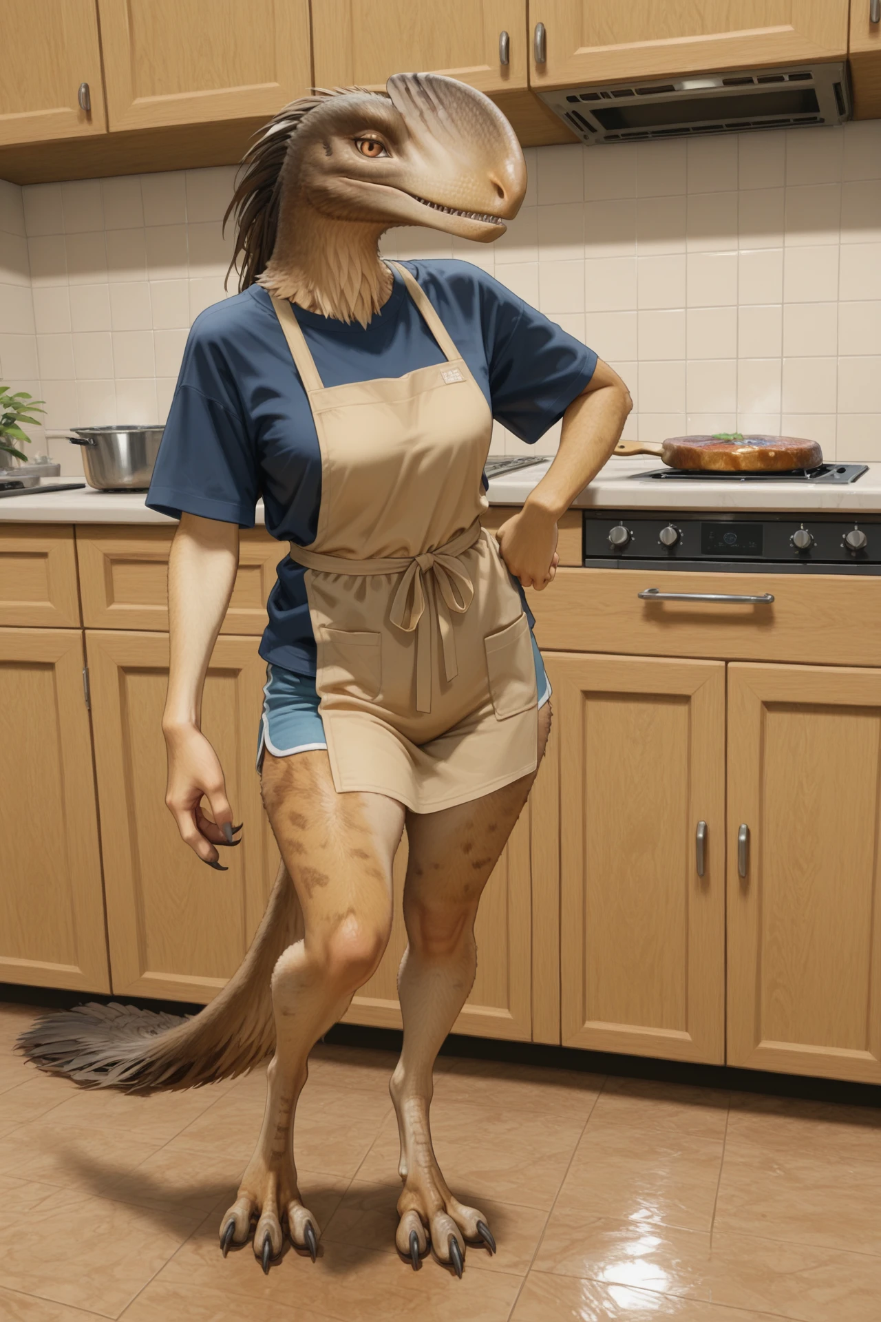 guanlong, brown feathered, orange eyes, claws, furry, head with crest, 3 fingers, 3 toes