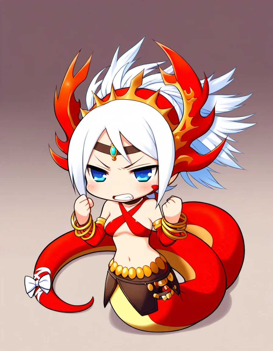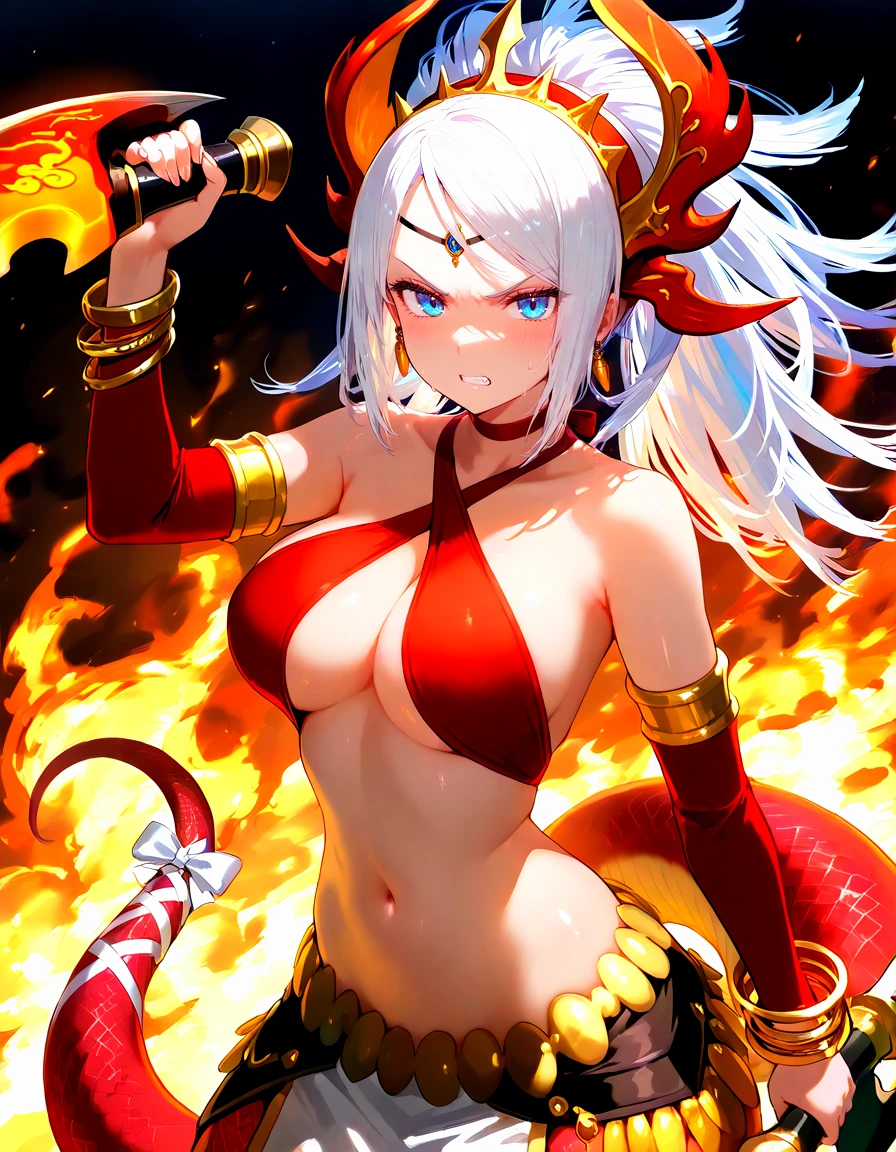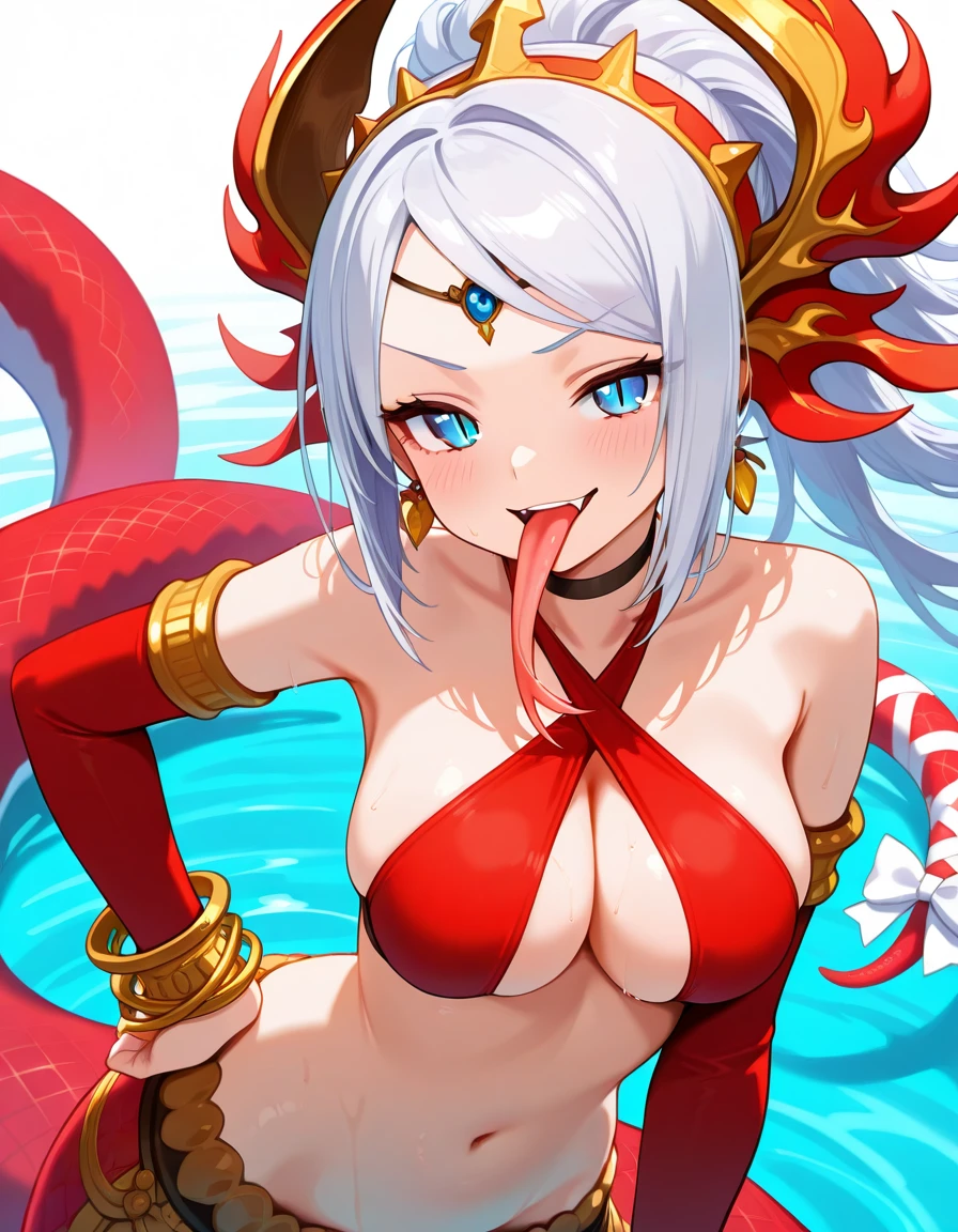 Recommended Prompts for PADechidnaU: 1girl, lamia, monster girl, white hair, blue eyes,tail ornament, tail,midriff, headdress, choker, earrings,criss-cross halter,halterneck,detached sleeves,tail bow,red scales,bangle,loincloth