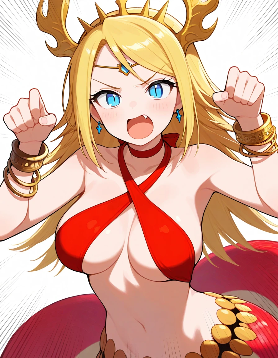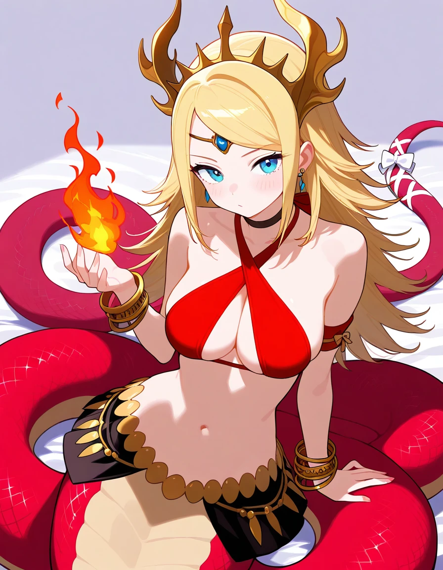 Recommended Prompts for PADechidnaE: 1girl, lamia, monster girl, blonde hair, blue eyes,tail ornament, tail,midriff, headdress, choker, earrings,criss-cross halter,halterneck,tail bow,red scales,bangle,