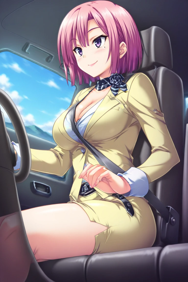 pink hair, short hair, bangs, purple eyes, tsurime, lipstick, mole under eye, large breasts,