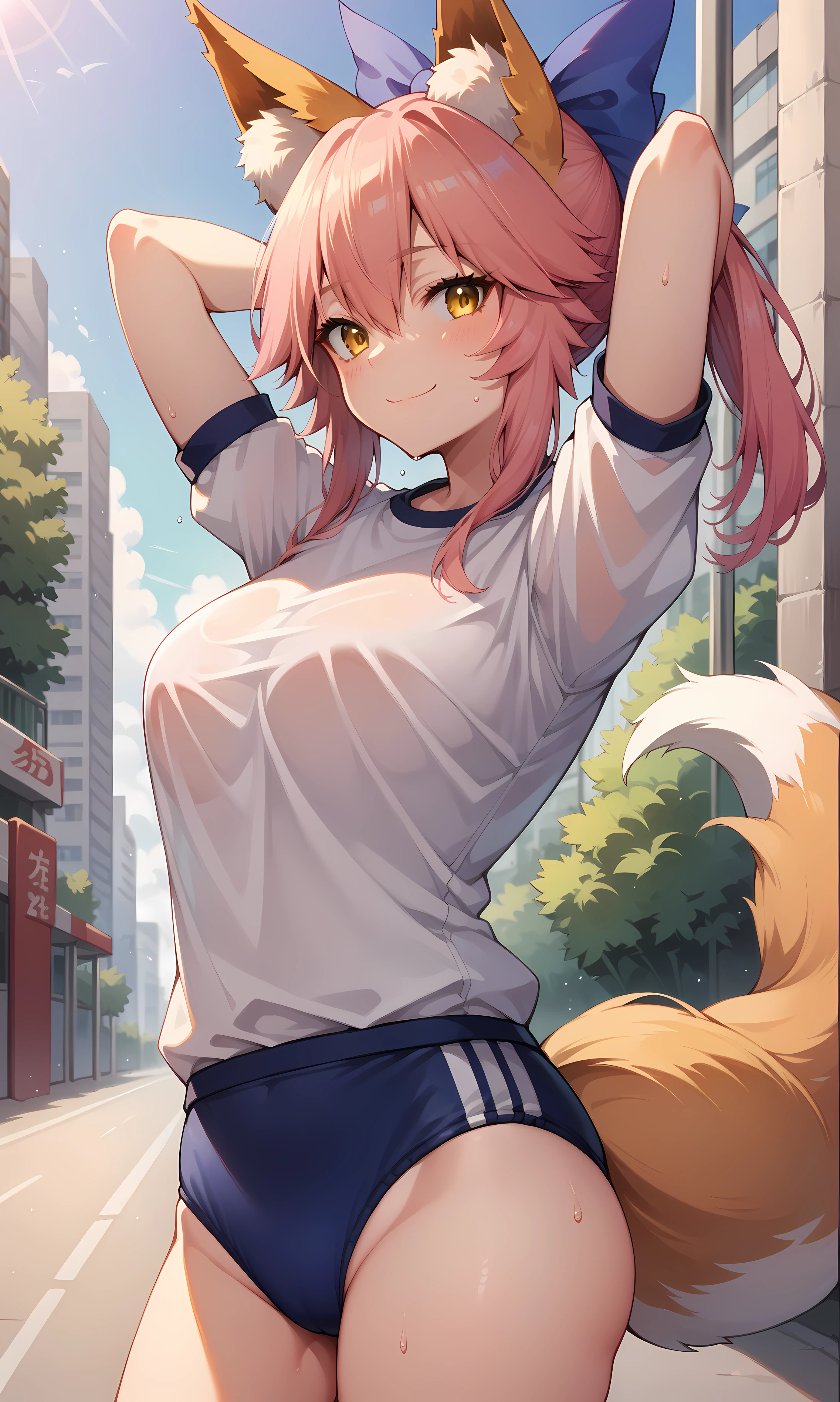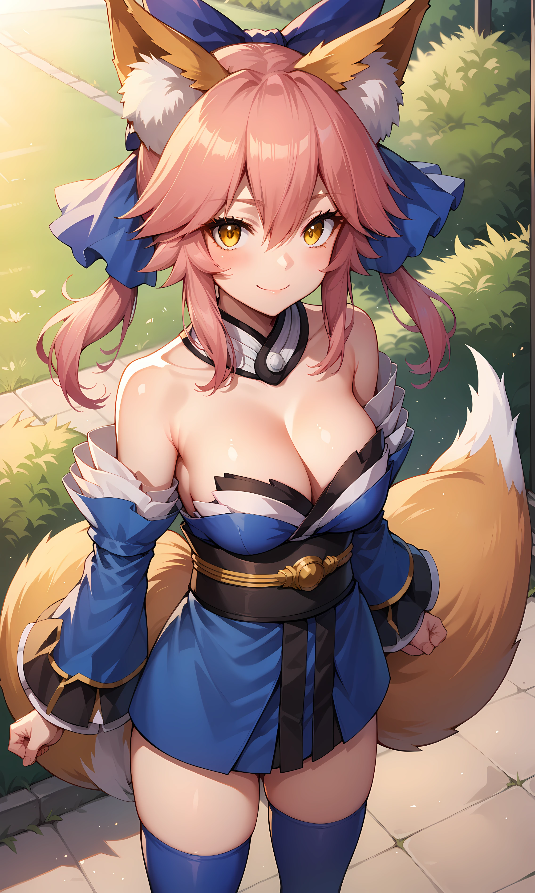 tamamo, pink hair, hair between eyes, sidelocks, short twintails, yellow eyes, animal ears, fox ears, fox tail