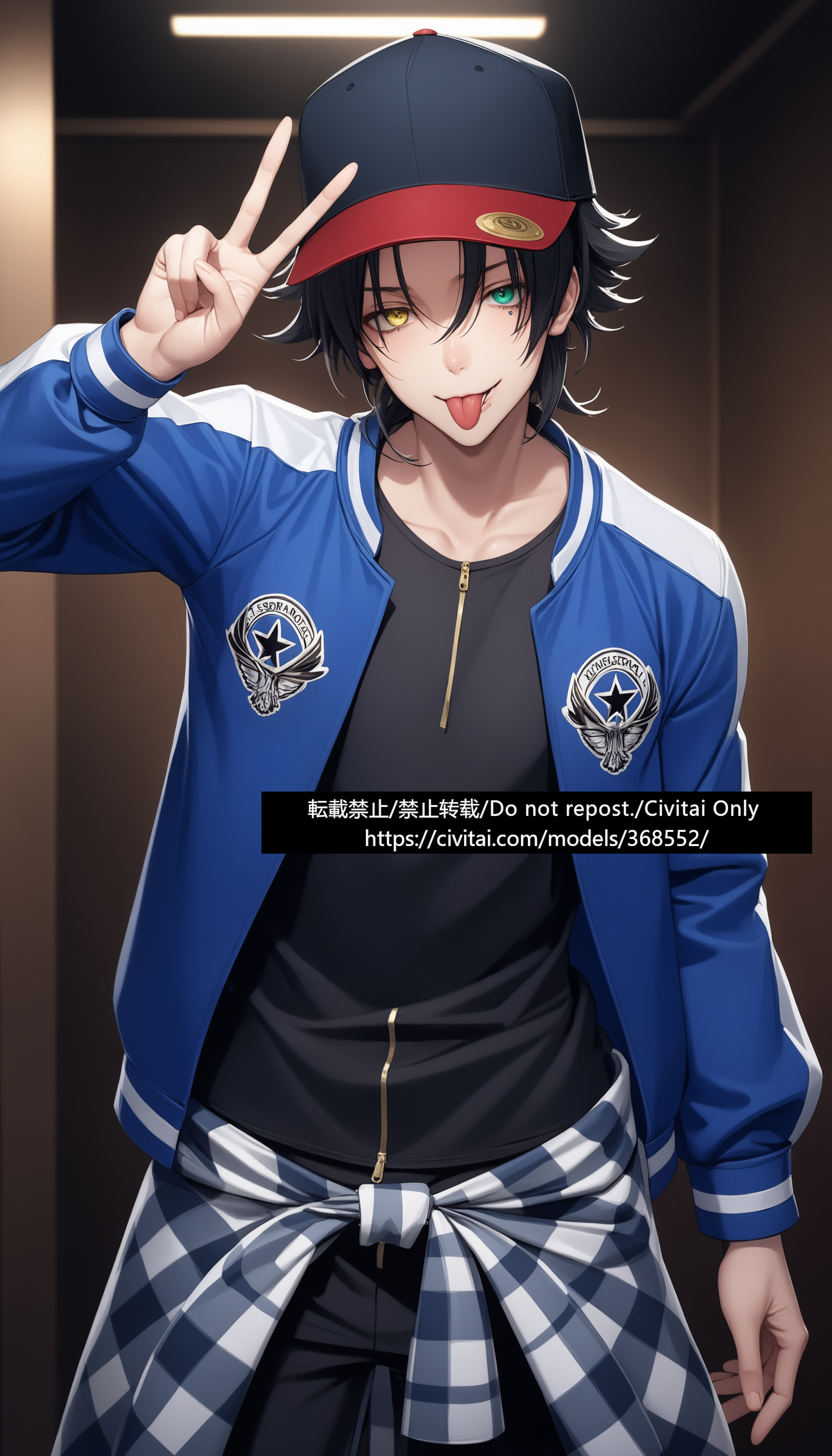 推奨ワード 1boy, solo, black hair, blue cap, yellow eyes, heterochromia, green eyes, two-toon jaket, blue jacket, long sleeves, white sleeves, checkered clothes around waist, male focus, black shirt, black pants, red brim,