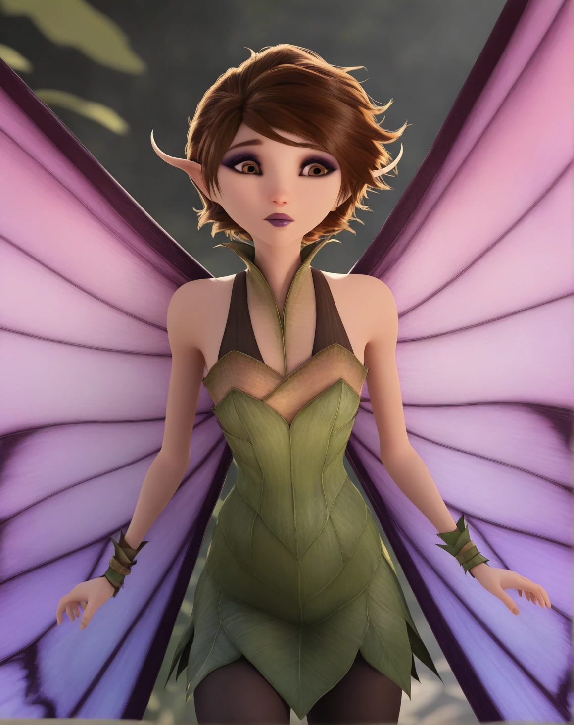 Marianne_1, wings, 3d, masterpiece, best quality, absurdres, newest, 1girl, solo, fairy, pointy ears, butterfly wings, short hair, fairy wings, dress, brown hair, bare shoulders, fairy girl, brown hair, short hair, pointy ears, brown eyes, eyeshadow, lipstick, short dress, leaf dress, black pantyhose, wrist accessory, bare shoulders, butterfly wings, fairy wings, purple wings,