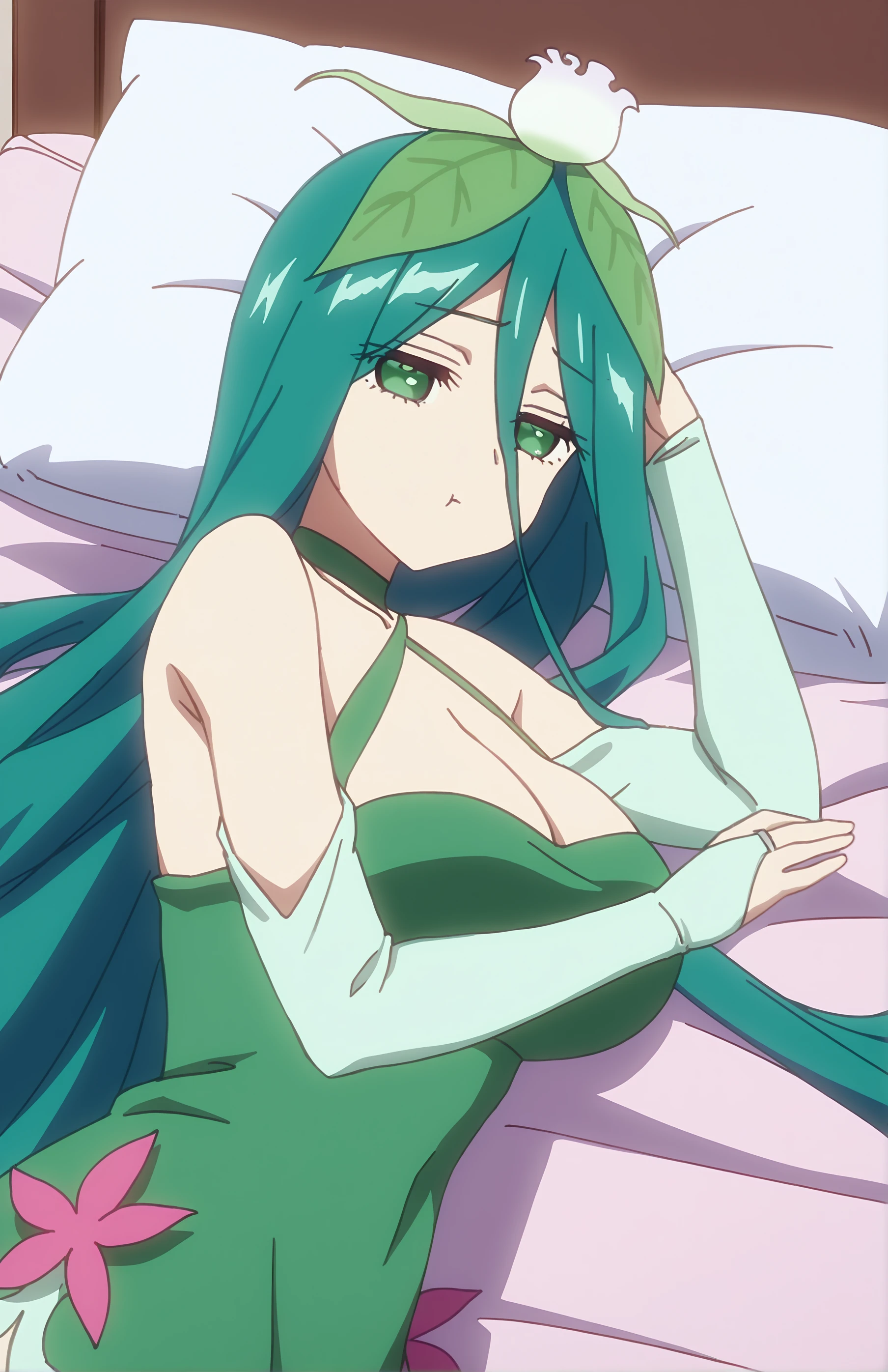 NeoAlraune, long hair, breasts, large breasts, hair ornament, dress, cleavage, hair between eyes, very long hair, green eyes, flower, bridal gauntlets, green hair, hair flower, leaf, green dress