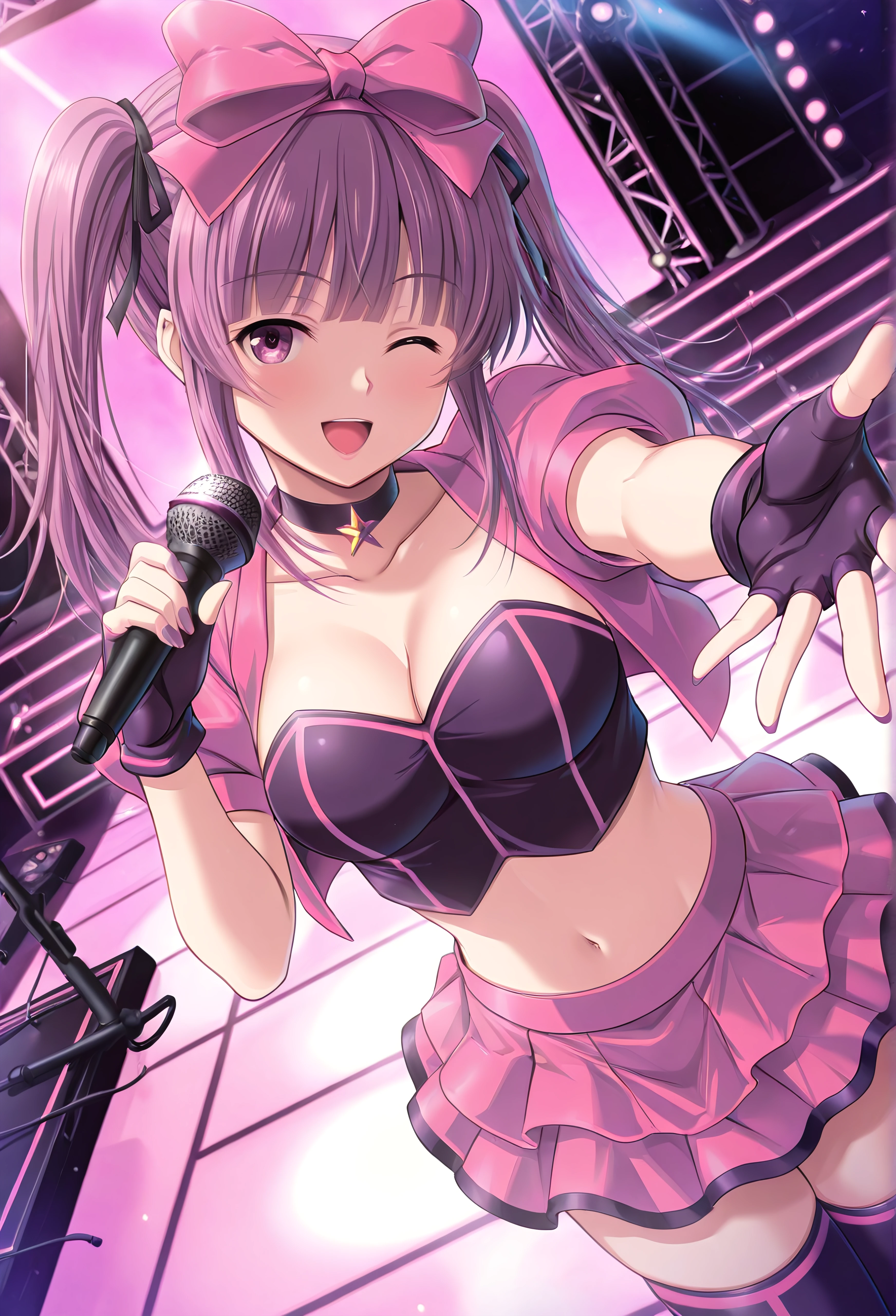 Outfit (Idol): yasakaaoriidol, star choker, pink hair bow, black hair ribbons, twintails, fingerless gloves, purple jacket, crop top, purple layered miniskirt, black thighhighs, pink ankle boots, pink panties
