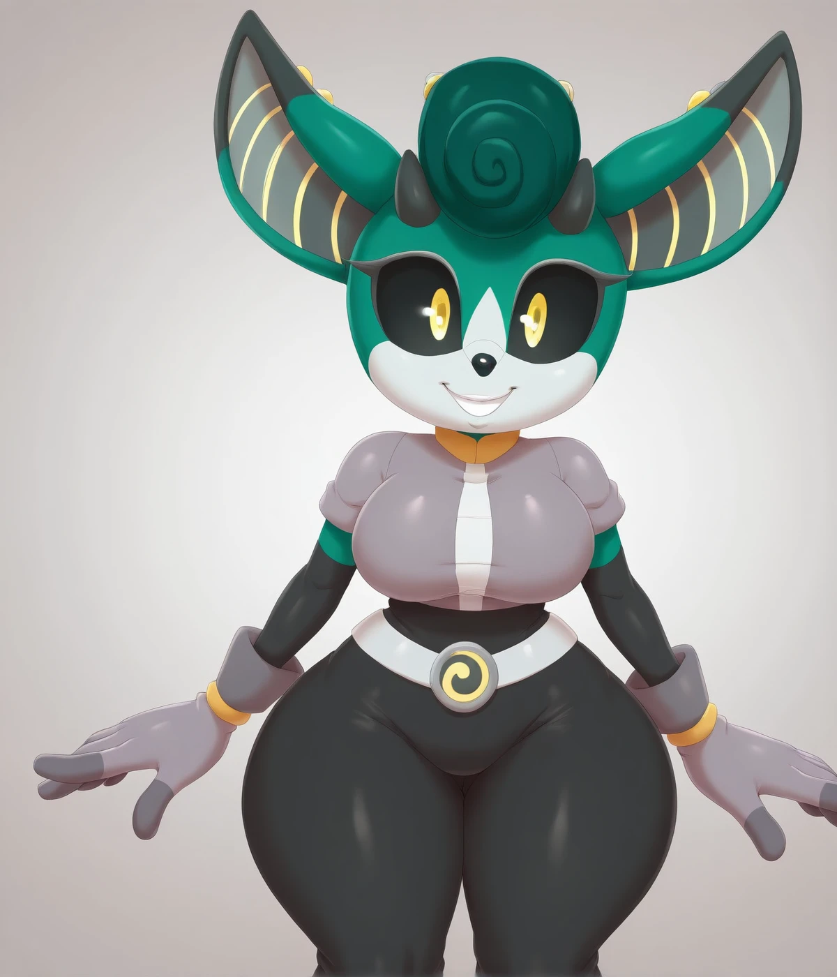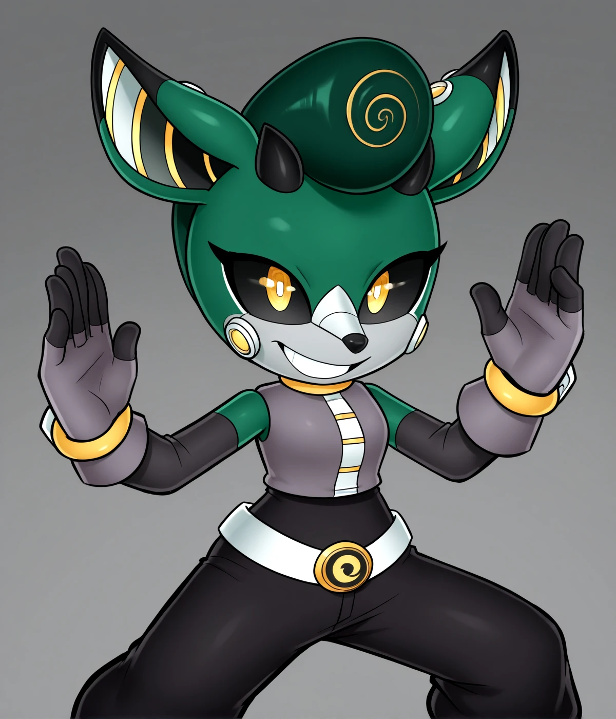 Helper tags: grey uniform, short sleeves, black pants, black sclera, screen eyes, yellow eyes, pompadour, 2 short horns, belt, grey gloves, sonic (series)