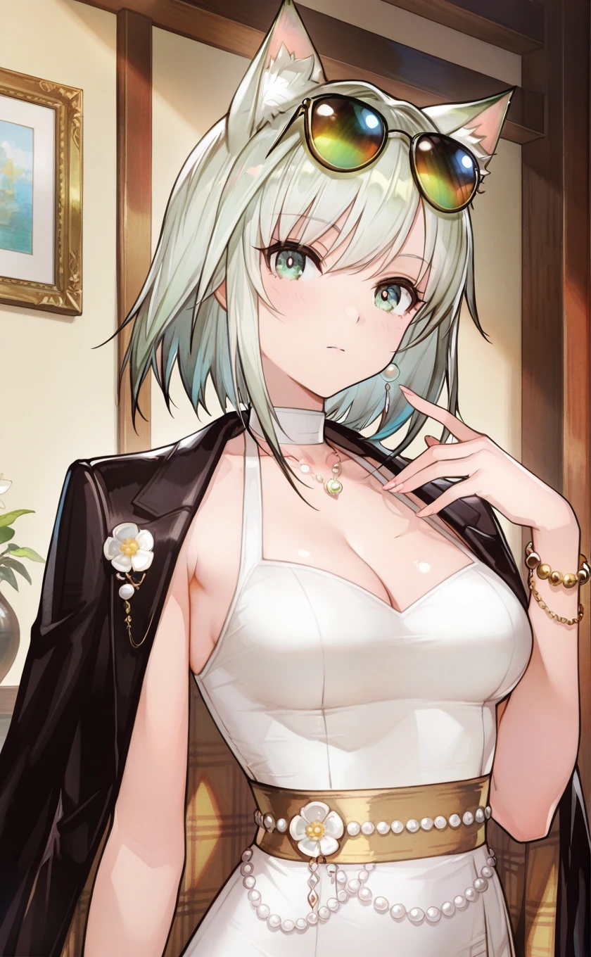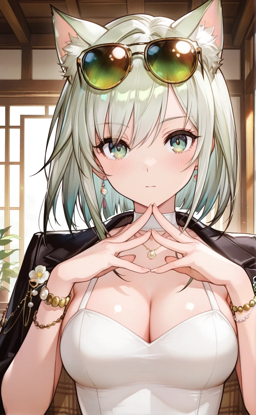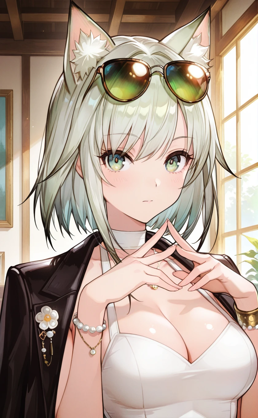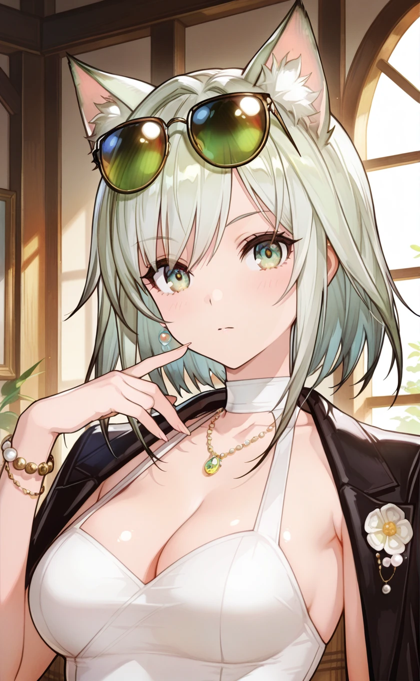 sunglasses,eyewear on head,cat ears,animal ears,short hair,grey hair,green hair,green eyes