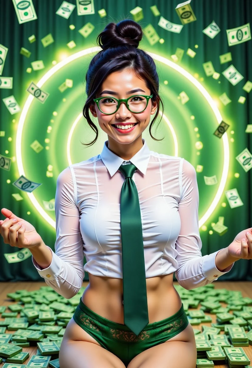 28-year-old Filipina female,, slightly thick thighs, short, wearing green-rimmed glasses, green eyes, slim but thick