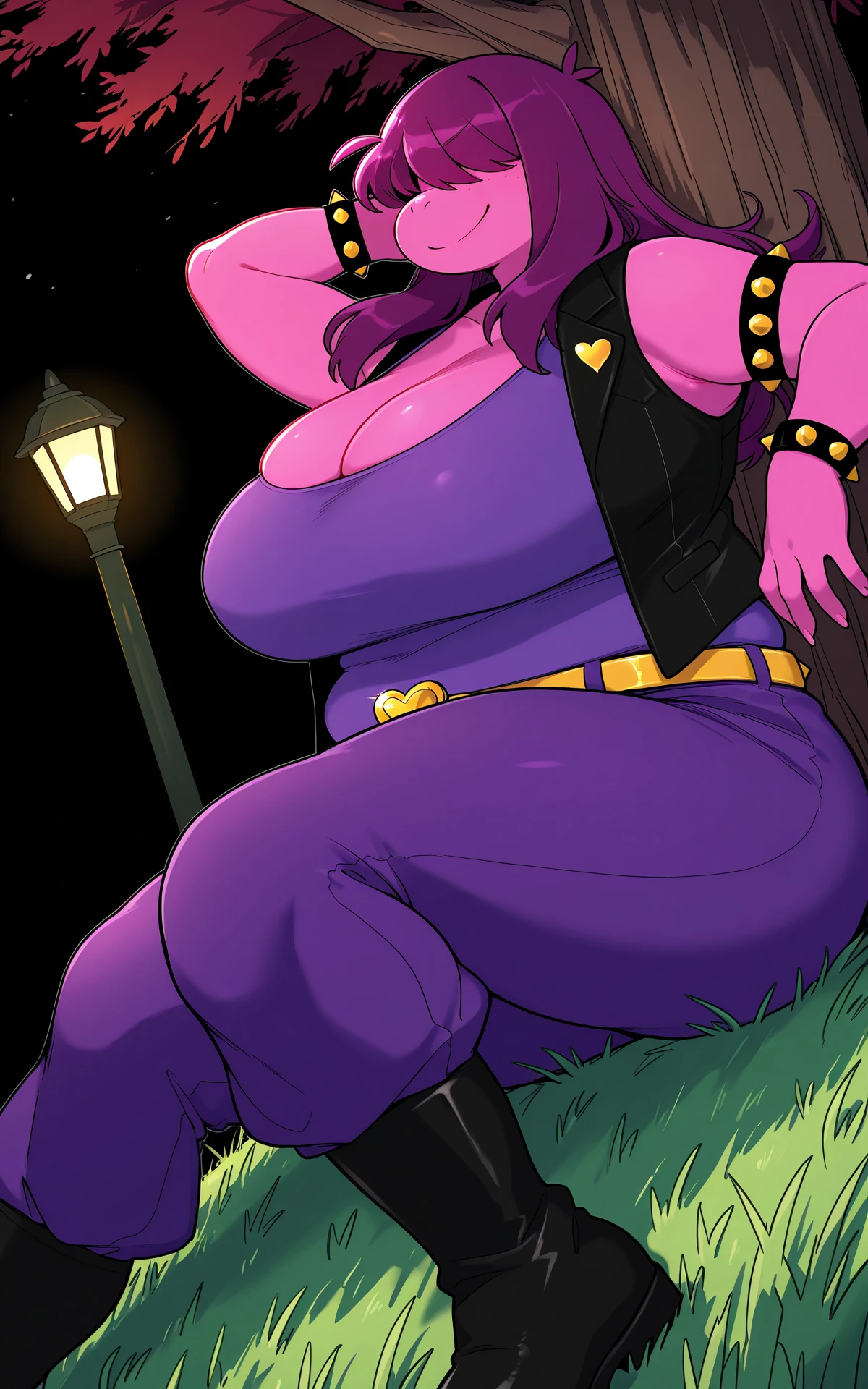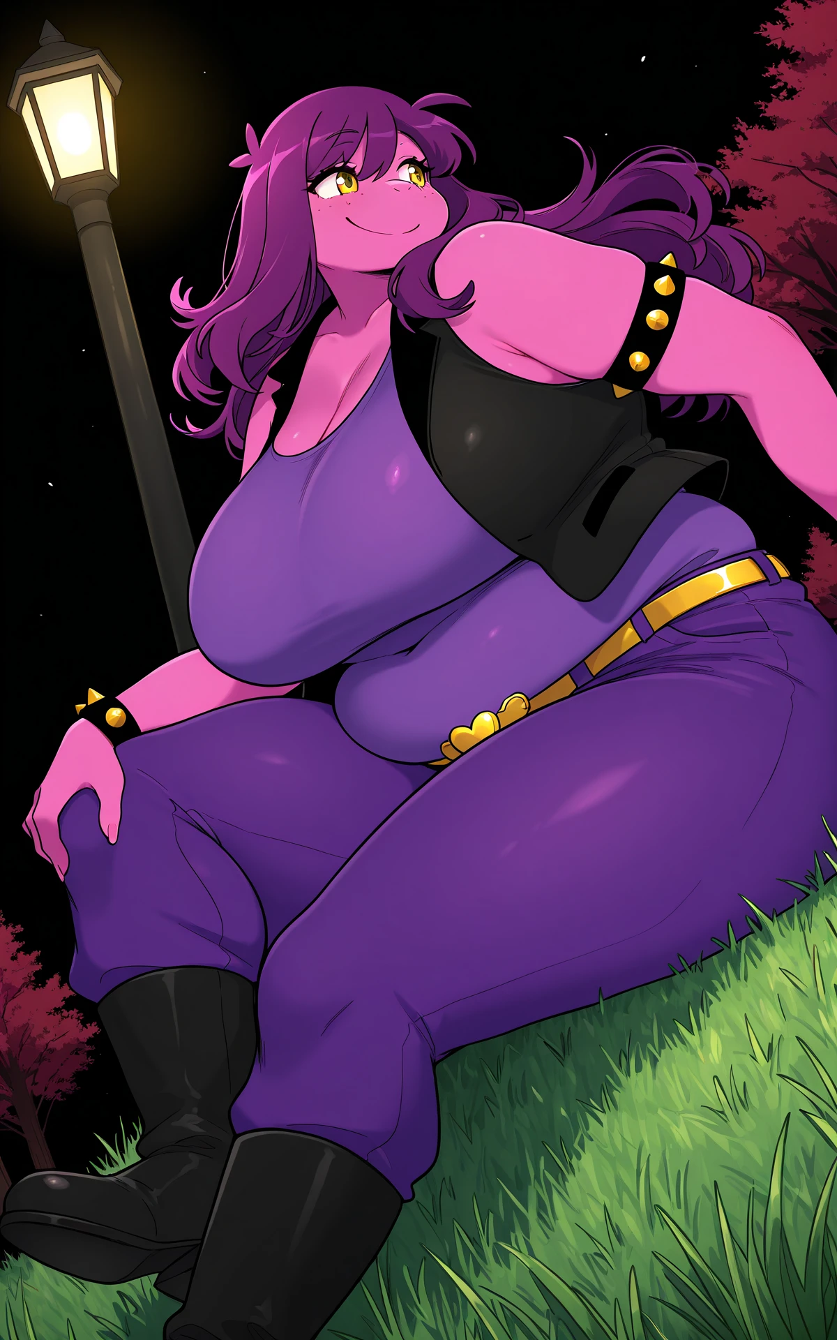 ((black open vest)), spiked bangles, spiked arm bands, purple tank top, magenta pants, black boots, belt, gold heart belt buckle,