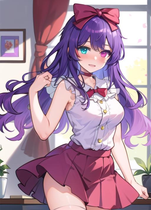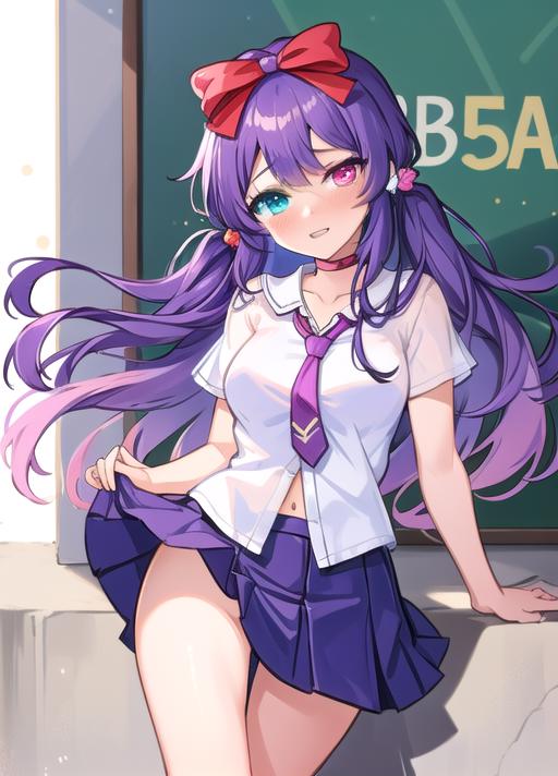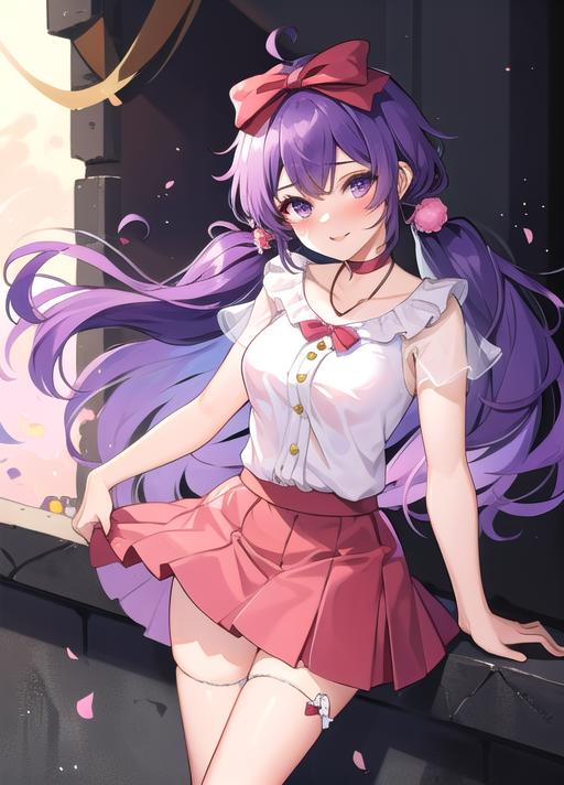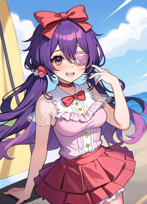 Trigger Words: Splendiferachie, purple gradient hair, long hair, bow, hair ornament, blue eyes, eyepatch, pink frilled skirt, white blouse, sheer dress, sheer clothes