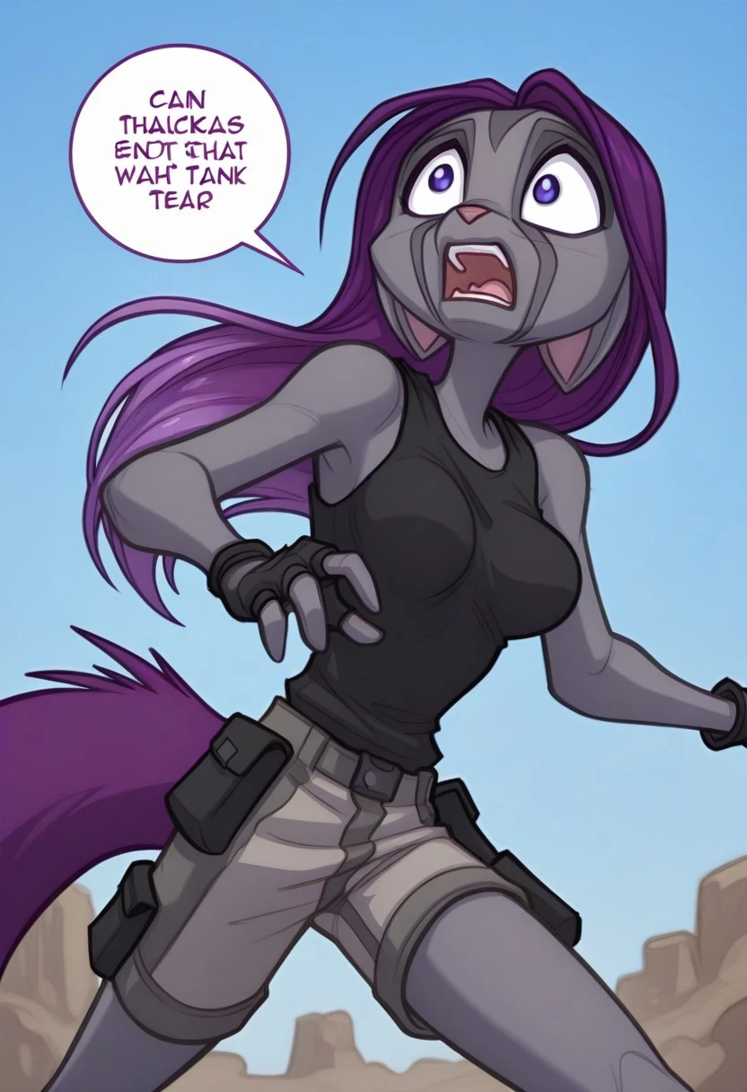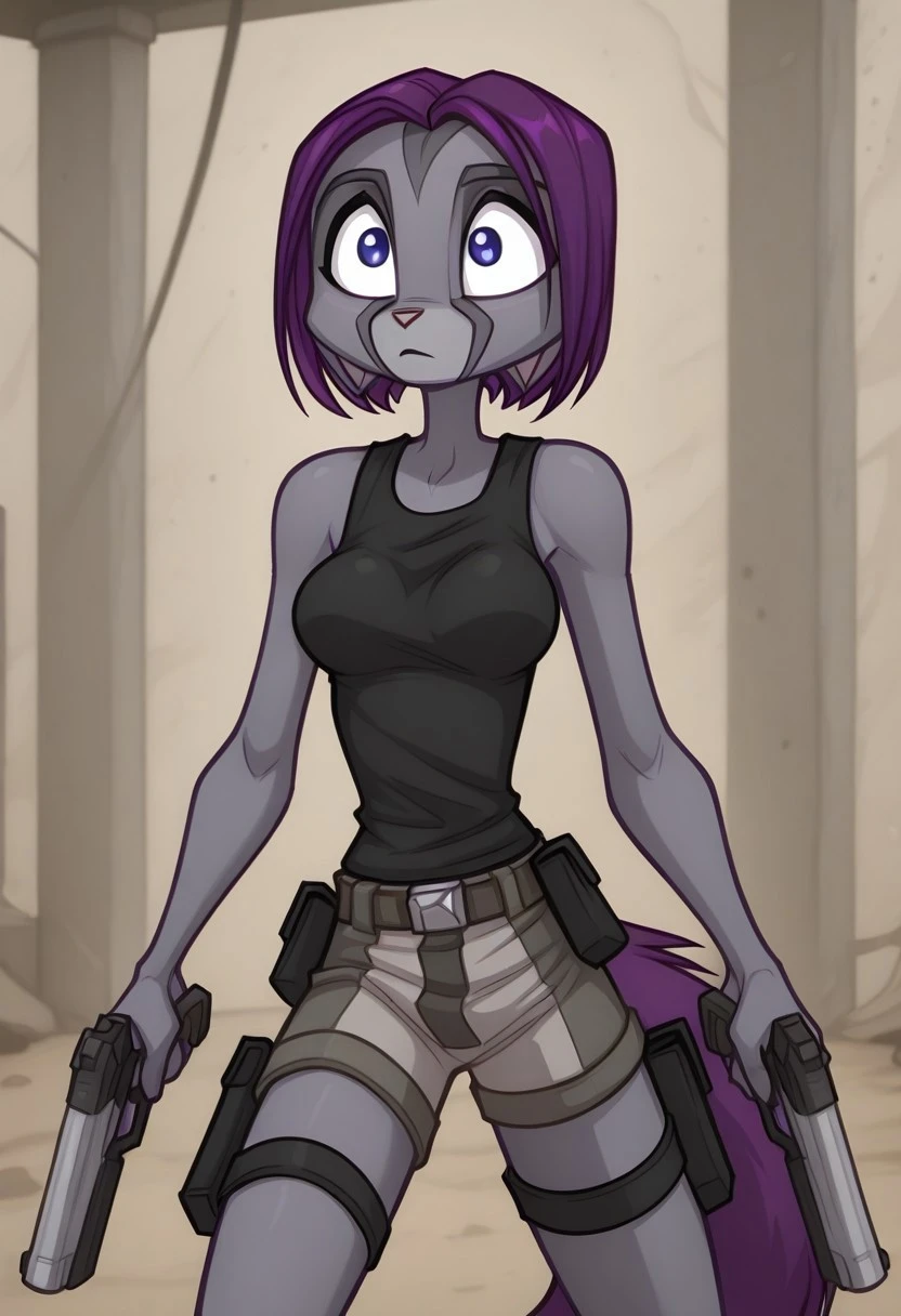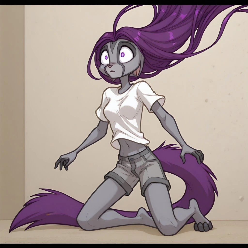 kalei: kalei, 1girl, furry, furry female, blue eyes, animal nose, purple hair, grey skin, animal ears, tail,