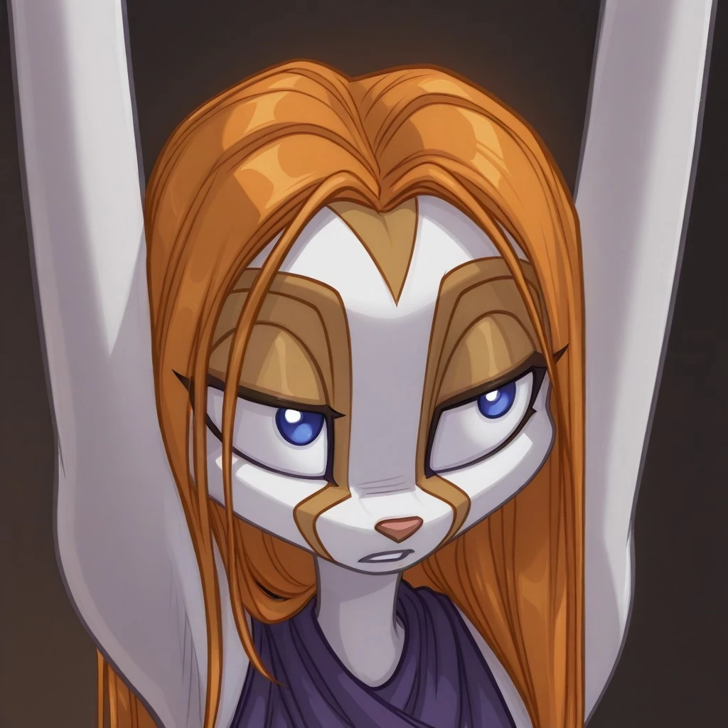 Jeneviv: jen, 1girl, furry, furry female, blue eyes, animal nose, blonde hair, white skin, animal ears, tail, golden facial features, golden eyeshadow,