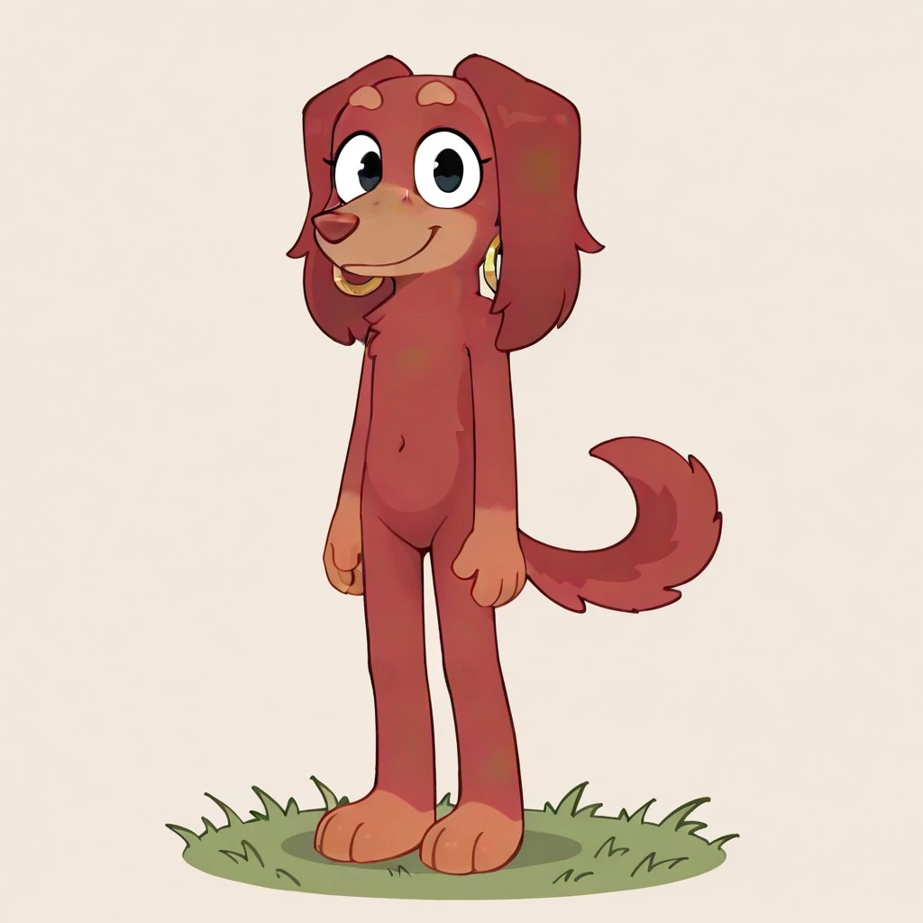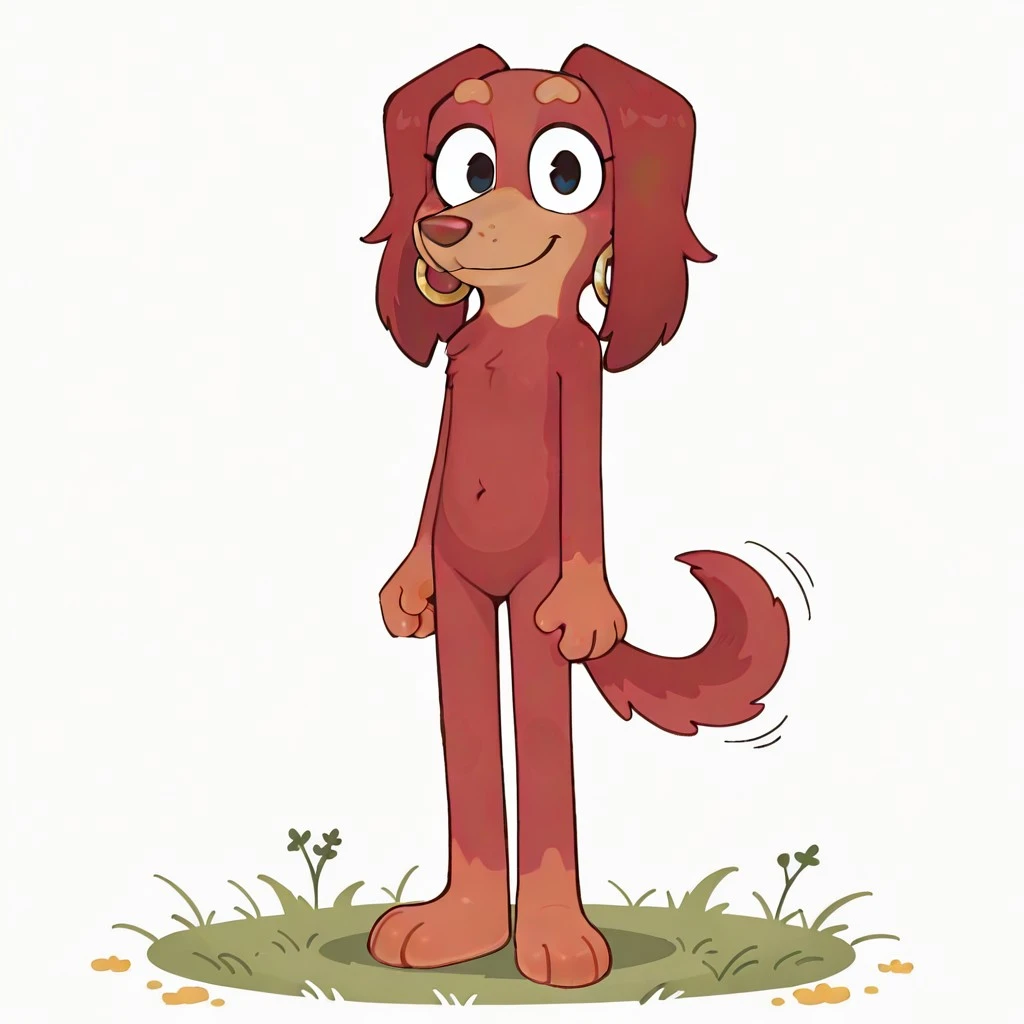 dog, dog girl, saluki, rusty red fur, black eyes, orange round eyebrows, brown nose, orange snout, floppy dog ears, dog tail, orange feet, gold hoop earrings,